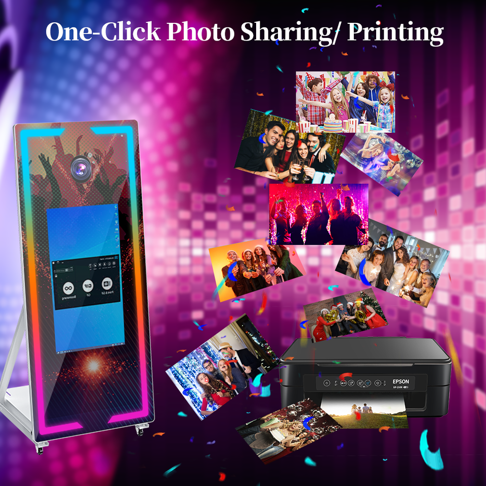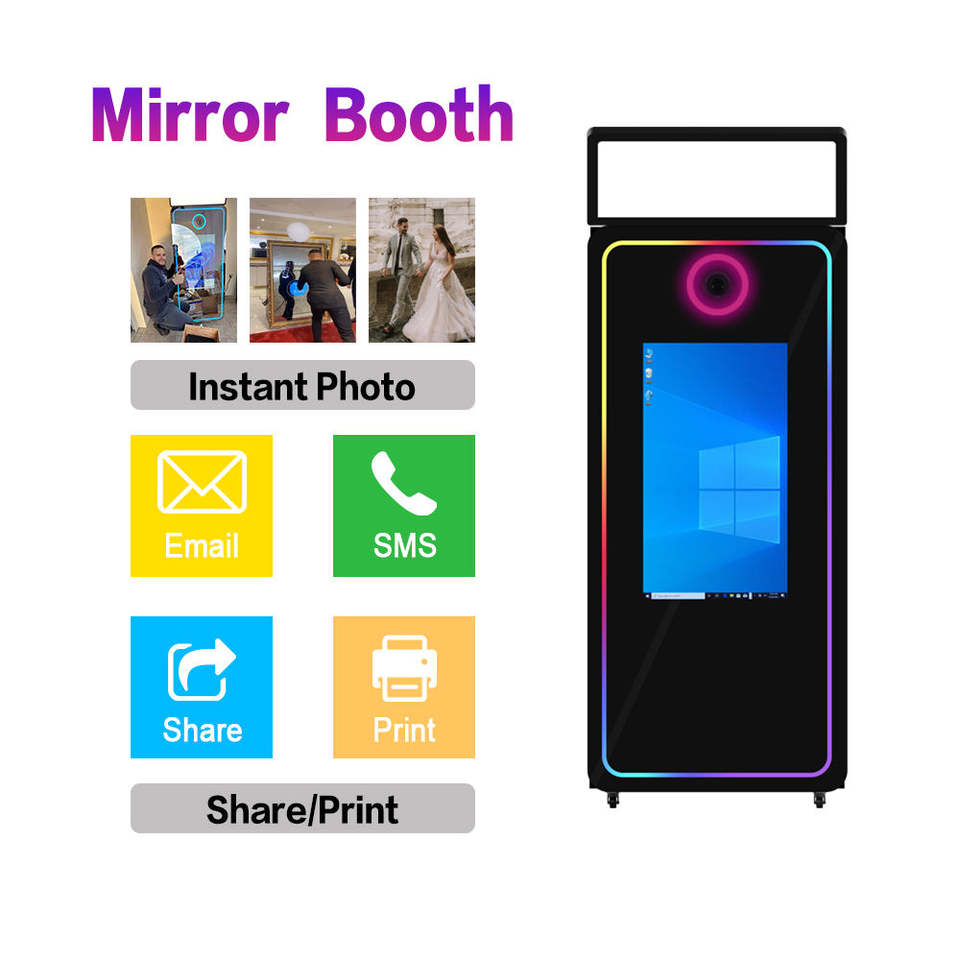 กระจกเซลฟี่ซุ้มโค้งทรงกลมแบบพกพาสำหรับถ่ายรูปพร้อมกล้องและเครื่องพิมพ์กระจกยืนหน้าจอสัมผัสแบบพกพา