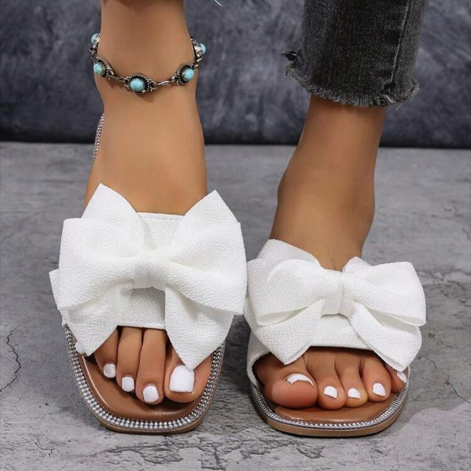 รองเท้าแตะหัวแบนทรงสี่เหลี่ยมสำหรับผู้หญิงรองเท้าแตะผูกโบว์ใหม่สำหรับการค้าต่างประเทศยุโรปและสหรัฐอเมริกา