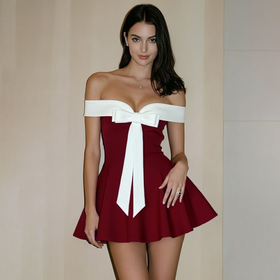 ชุดเดรสสีพื้นน่ารักสไตล์ยุโรปอเมริกันสำหรับคริสต์มาสและปีใหม่ แบบเปิดไหล่ผูกโบว์ที่เอว ทรงเข้ารูปทรงเอไลน์ มินิเดรสสำหรับงานปาร์ตี้