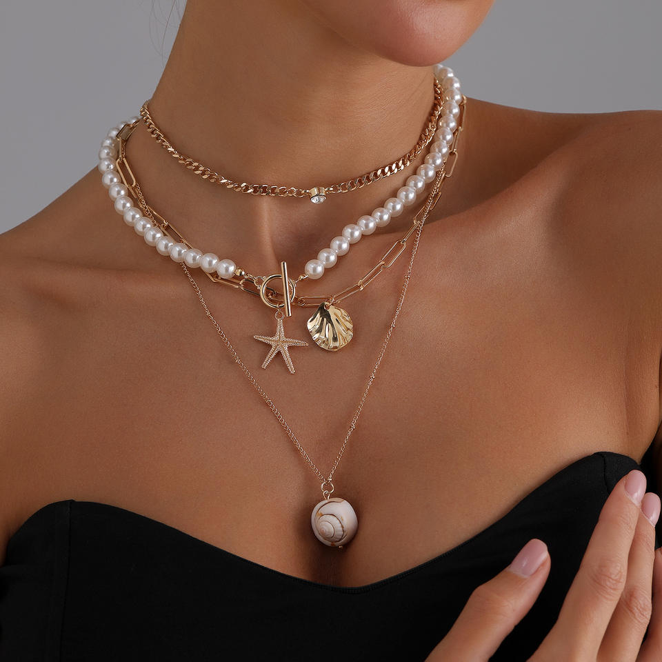 สร้อยคอปลาดาวไข่มุกสไตล์บาร็อคแฟชั่นยุโรปอเมริกันสำหรับผู้หญิงพร้อมเปลือกหอยและหอยสังข์บีชสบายๆ