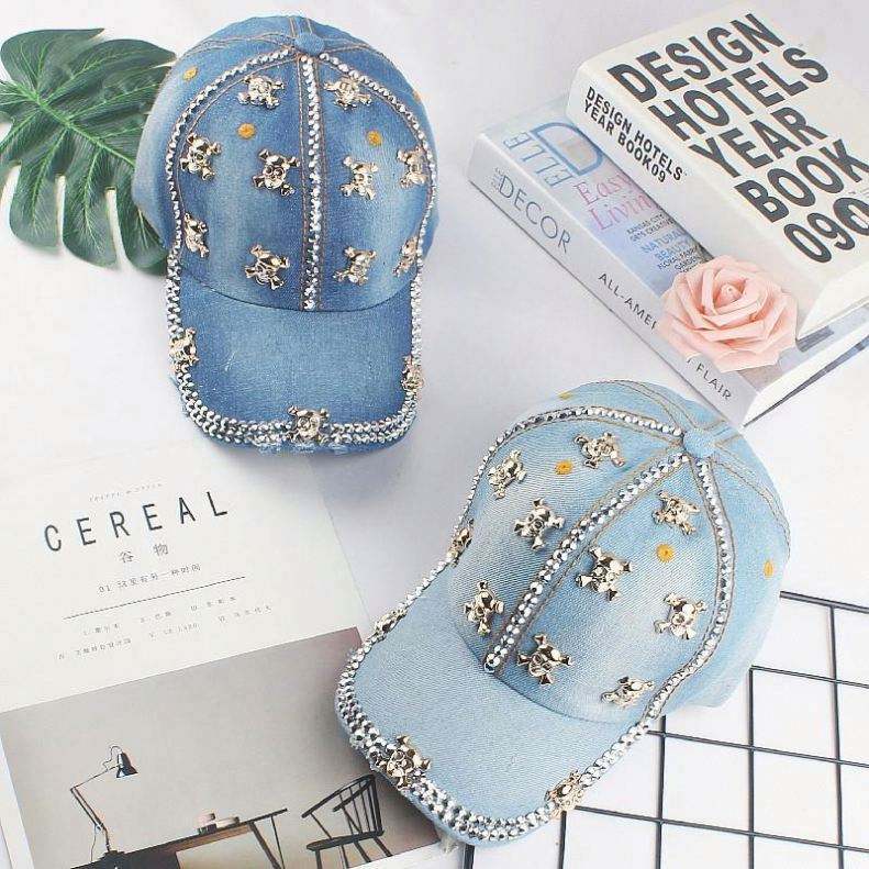 หมวกเบสบอลยีนส์ยุโรปอเมริกันคุณภาพสูง ล้างทำความสะอาดแล้ว แต่งลายขาดๆ ระบายอากาศได้ดี สวมใส่สบาย ปรับขนาดได้ ประดับด้วยคริสตัล