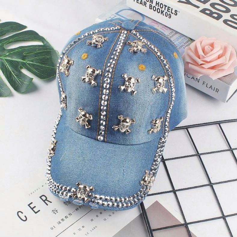 หมวกเบสบอลยีนส์ยุโรปอเมริกันคุณภาพสูง ล้างทำความสะอาดแล้ว แต่งลายขาดๆ ระบายอากาศได้ดี สวมใส่สบาย ปรับขนาดได้ ประดับด้วยคริสตัล