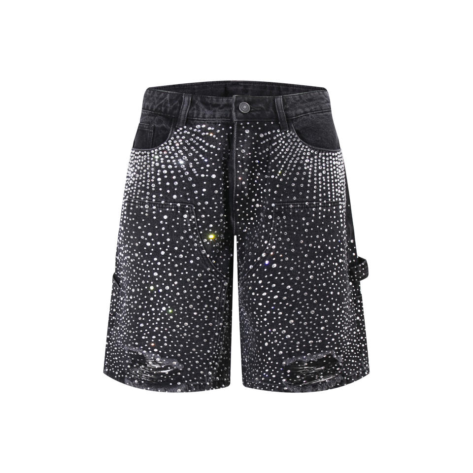 กางเกงขาสั้นผ้ายีนส์สำหรับผู้ชายแนวสตรีทแบบชาวยุโรปอเมริกันกางเกงครอปแบบสั้นสำหรับฤดูร้อนกางเกงขาสั้นประดับเพชรเครื่องมือไล่ระดับสีแบบใหม่สำหรับผู้ชาย