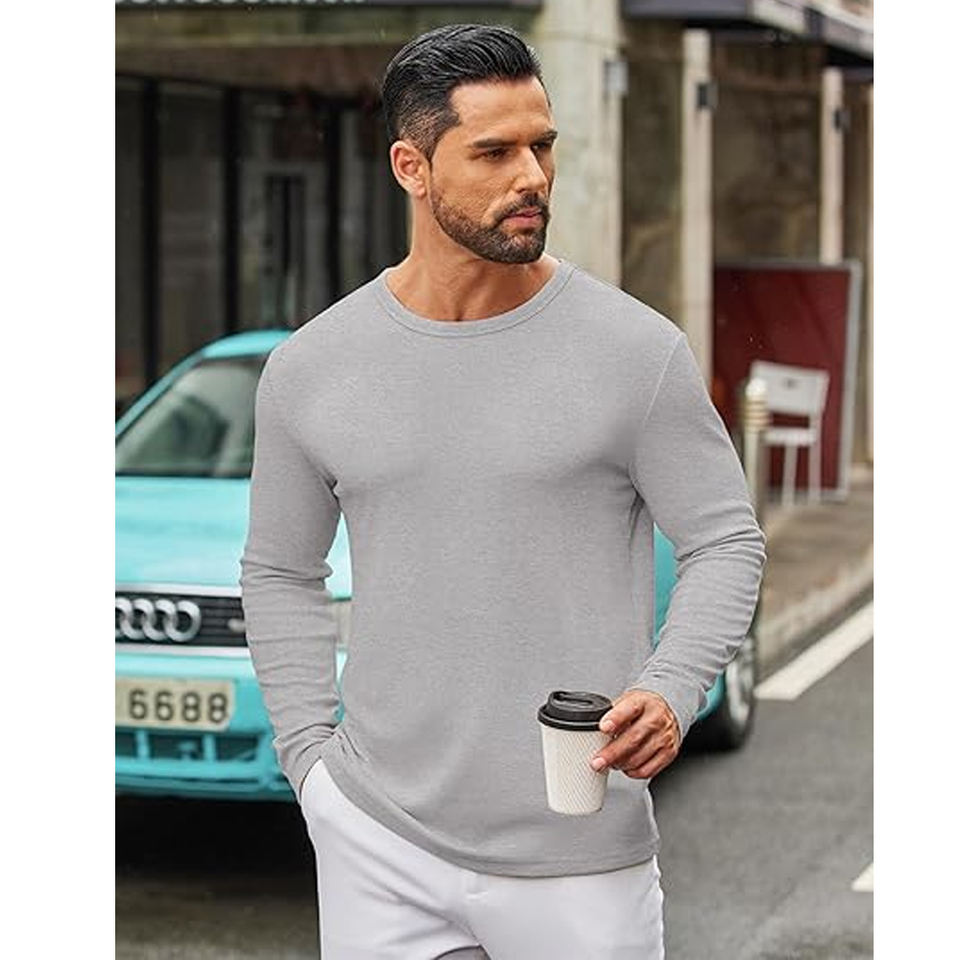 เสื้อยืดแขนยาวลำลองผู้ชายสไตล์ยุโรปอเมริกัน คอกลม ผ้าวาฟเฟิล สีพื้น ดีไซน์เรียบง่าย สำหรับฤดูใบไม้ผลิ ฤดูใบไม้ร่วง เหมาะสำหรับออกกำลังกายและใส่ไปคลับ