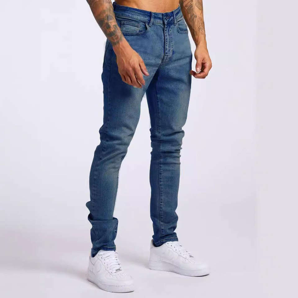 กางเกงยีนส์ทรงสลิมเอวสูงสำหรับผู้ชายสไตล์ยุโรปอเมริกัน สีดำทันสมัย ทรงตรง ลาย 3 มิติ สไตล์ลำลอง ขาเล็ก