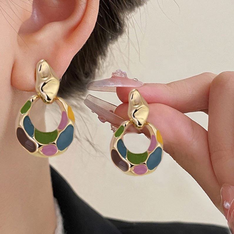 ต่างหูผู้หญิงสไตล์ยุโรป-อเมริกัน ย้อนยุค หรูหราเบาๆ ระดับไฮเอนด์ ดีไซน์เรขาคณิต ลงสีแบบหยดน้ำ วัสดุอัลลอย