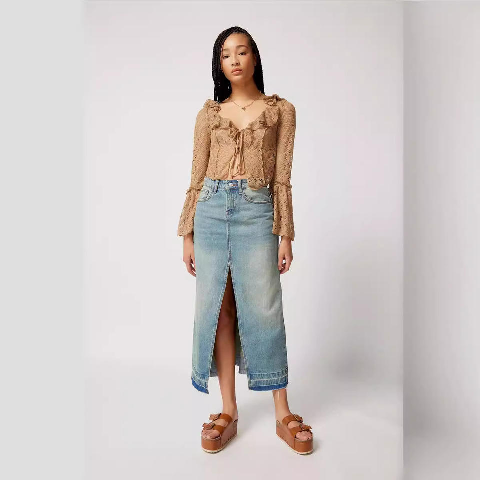 กระโปรงยีนส์ทรงยาวสไตล์ยุโรปอเมริกันย้อนยุค ผ้าฝ้ายเนื้อหนาปานกลาง สำหรับผู้หญิง สีน้ำเงิน/ดำ เอวทรงครุย