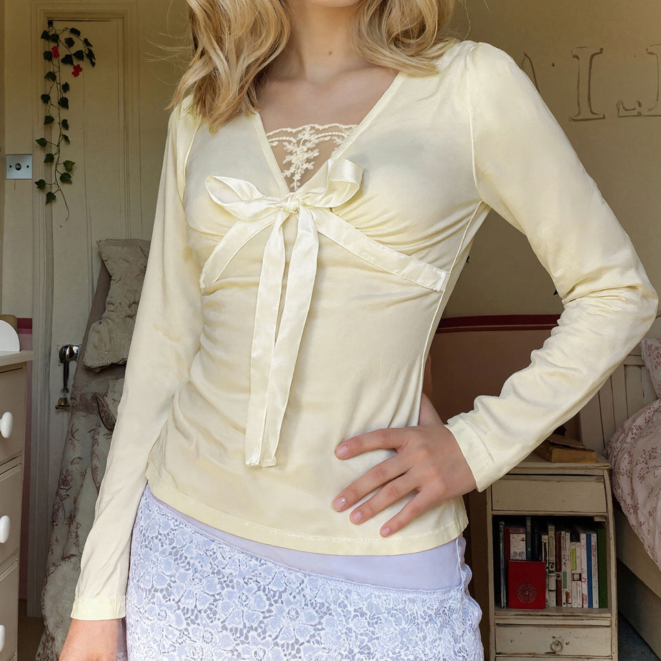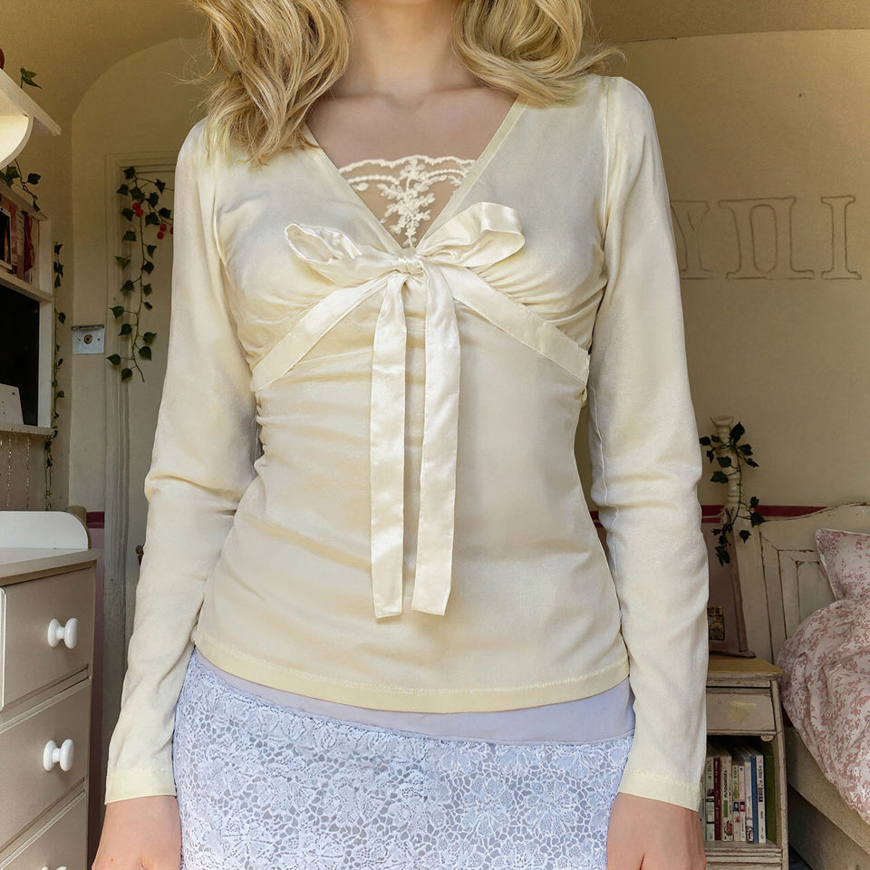 เสื้อท็อปผู้หญิงสไตล์ยุโรปอเมริกัน คอวี แต่งลูกไม้ โบว์ แขนยาว ทรงเข้ารูป ดีไซน์สองชั้น ดูเป็นเสื้อยืดสองชั้น