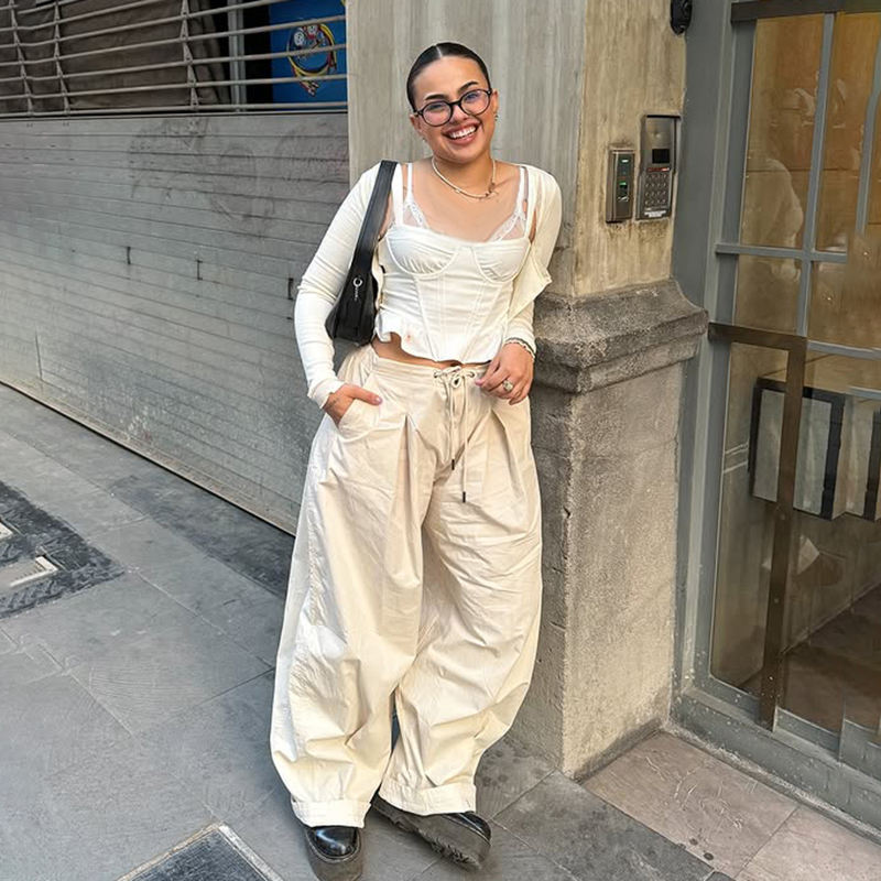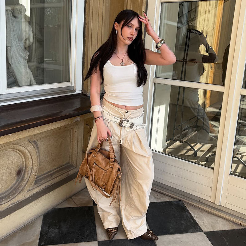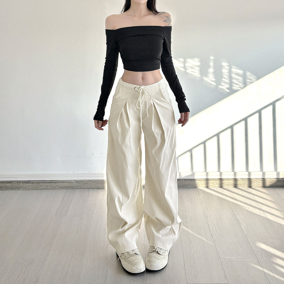 กางเกงขายาวทรงหลวมเอวต่ำสไตล์ยุโรปอเมริกันสำหรับผู้หญิง สีพื้น มีเชือกผูก แต่งระบาย ขากว้าง สวมใส่สบาย