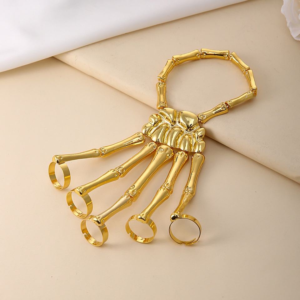 กำไลข้อมือห้านิ้วสไตล์ยุโรปอเมริกัน แฟชั่นเก๋ไก๋ ดีไซน์หัวกะโหลกแนวพังก์ แบบปรับได้ พร้อมโซ่ในตัว