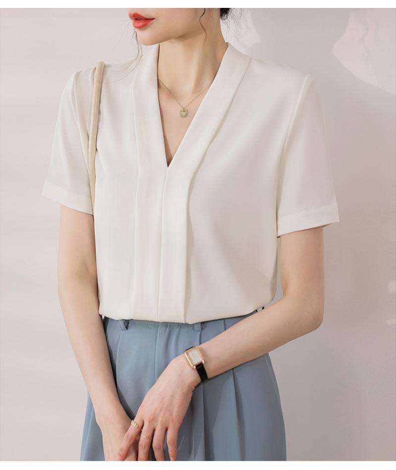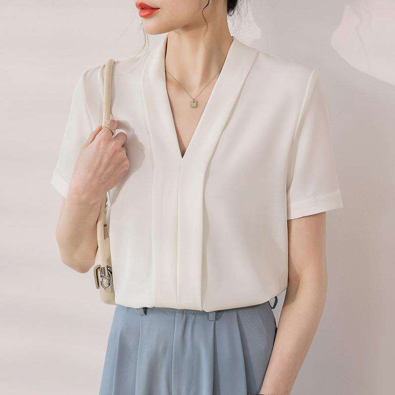 เสื้อเบลาส์แขนสั้นคอวีทรงหลวมของผู้หญิงสไตล์ยุโรปใส่สบายมีสไตล์สำหรับสวมใส่ในชีวิตประจำวัน