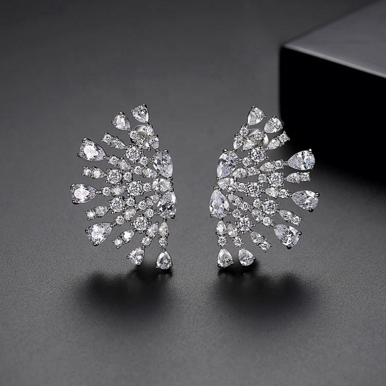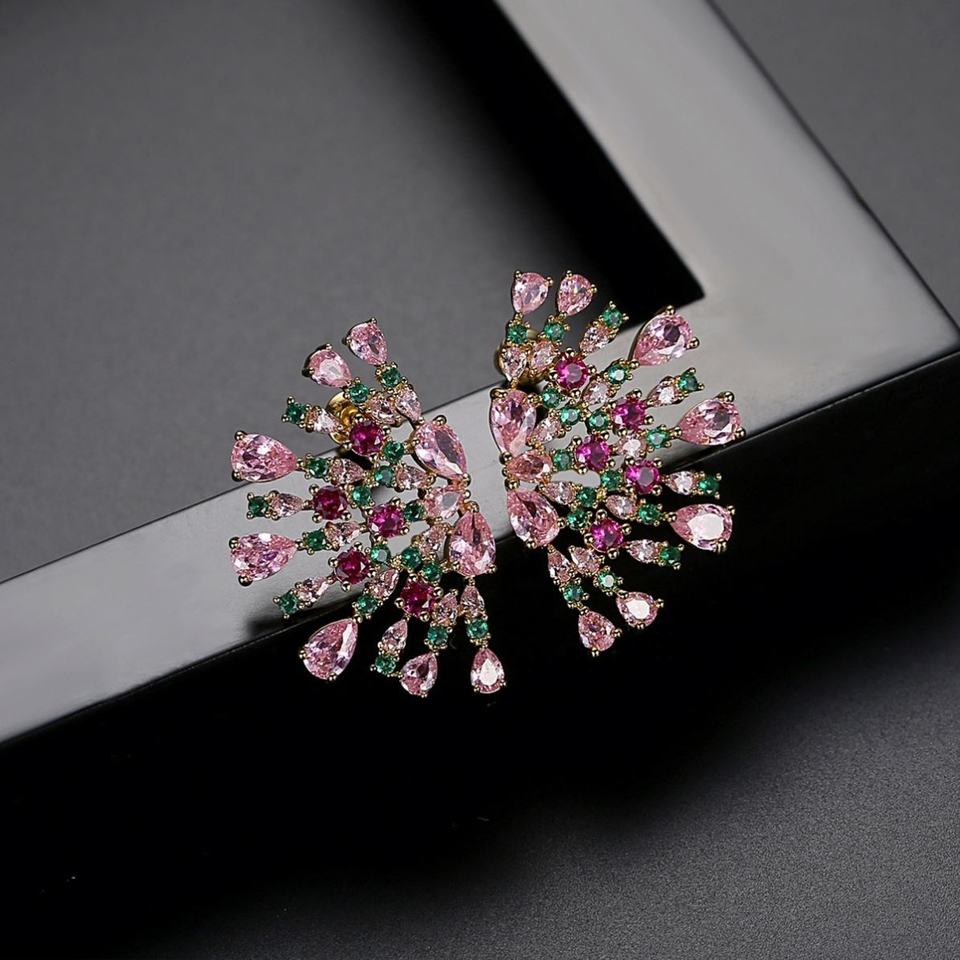 ต่างหูผู้หญิงสไตล์ยุโรปอเมริกันสุดฮิต สีแดงนกยูง ประดับเพชรซิคอนรูปดอกไม้ ชุบทอง