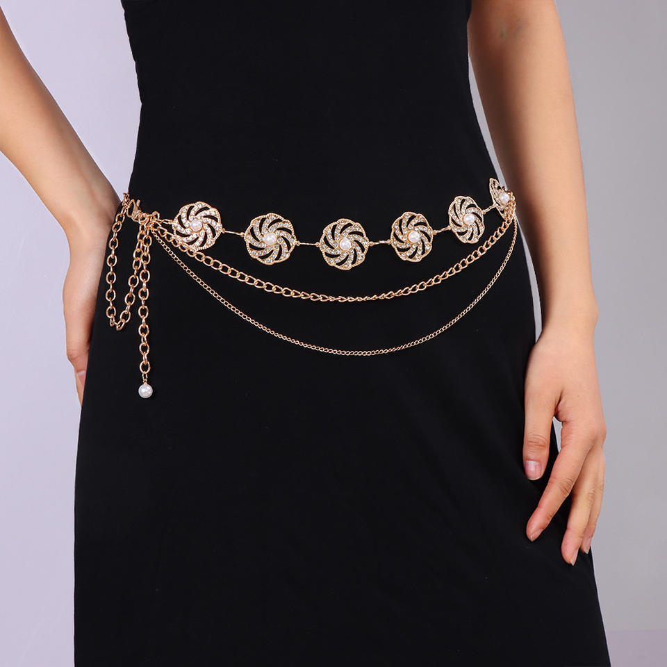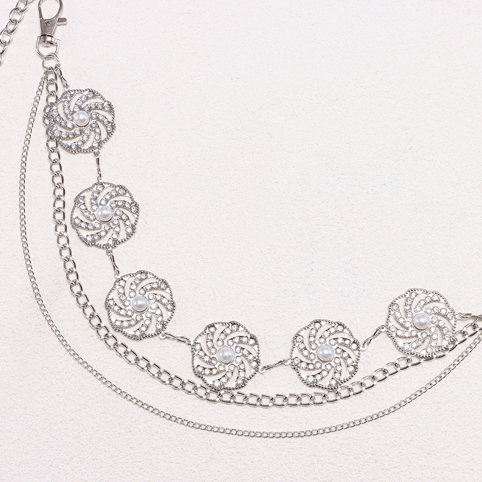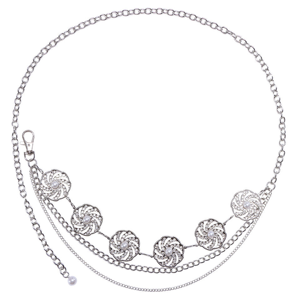 โซ่คาดเอวสไตล์ยุโรปอเมริกัน รูปทรงเรขาคณิต โลหะแบบกลวงประดับด้วยเพชรเทียมและมุก สำหรับงานปาร์ตี้ แฟชั่นสีเงิน ทำจากโลหะผสมสังกะสี