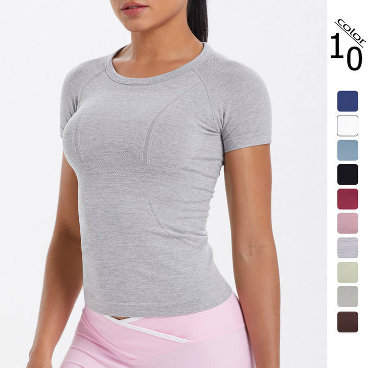 European American Women's Cross-Border Sports Fitness Yoga Wear Short-Sleeved T-Shirt Breathable Seamless Knitted Solid Color