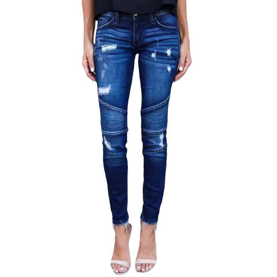 กางเกงยีนส์เดนิมทรงสกินนี่เอวสูงแบบสลิมฟิตสำหรับผู้หญิงสไตล์ยุโรป-อเมริกัน แต่งพู่ จีบ ขาด แต่งผ้าต่อกัน ยืดหยุ่น แห้งเร็ว นำเข้า