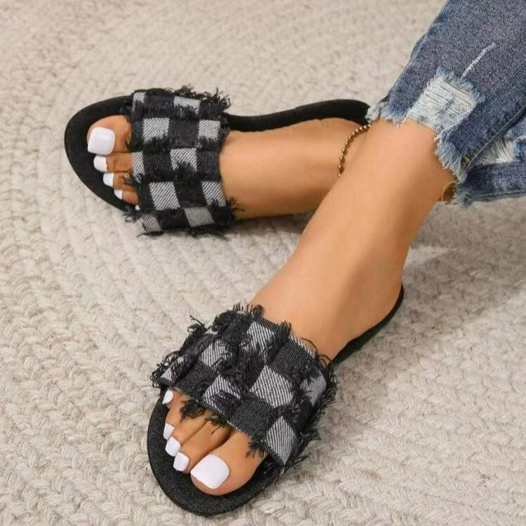 รองเท้าแตะแบบสวมสำหรับฤดูร้อนของผู้หญิงยุโรปอเมริกัน ลายสก็อตผ้ายีนส์ ไซส์ใหญ่ สำหรับการค้าต่างประเทศ