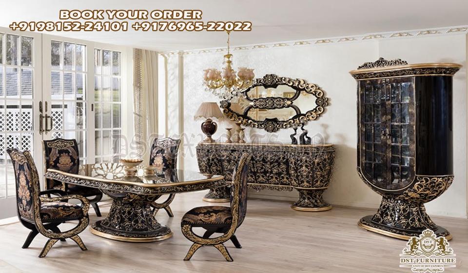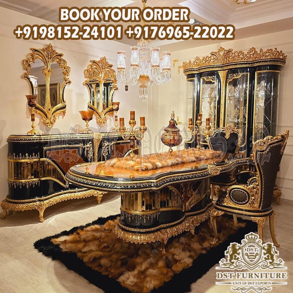 ชุดโต๊ะรับประทานอาหารสไตล์บาโรกยุโรปสีดำทอง พร้อมเฟอร์นิเจอร์ไม้แกะสลักคุณภาพพรีเมียม สไตล์มหาราชา ชุดโต๊ะรับประทานอาหาร 10 ที่นั่ง สหราชอาณาจักร