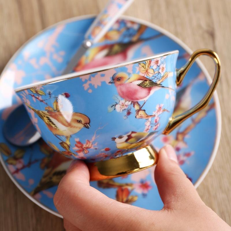 ชุดถ้วยชาพร้อมจานรองลายดอกไม้และนกสไตล์ชนบทสดใส ดีไซน์หรูหราคลาสสิกแบบยุโรป ขอบทอง ทำจากกระดูกจีน ปลอดสาร BPA เป็นมิตรต่อสิ่งแวดล้อม