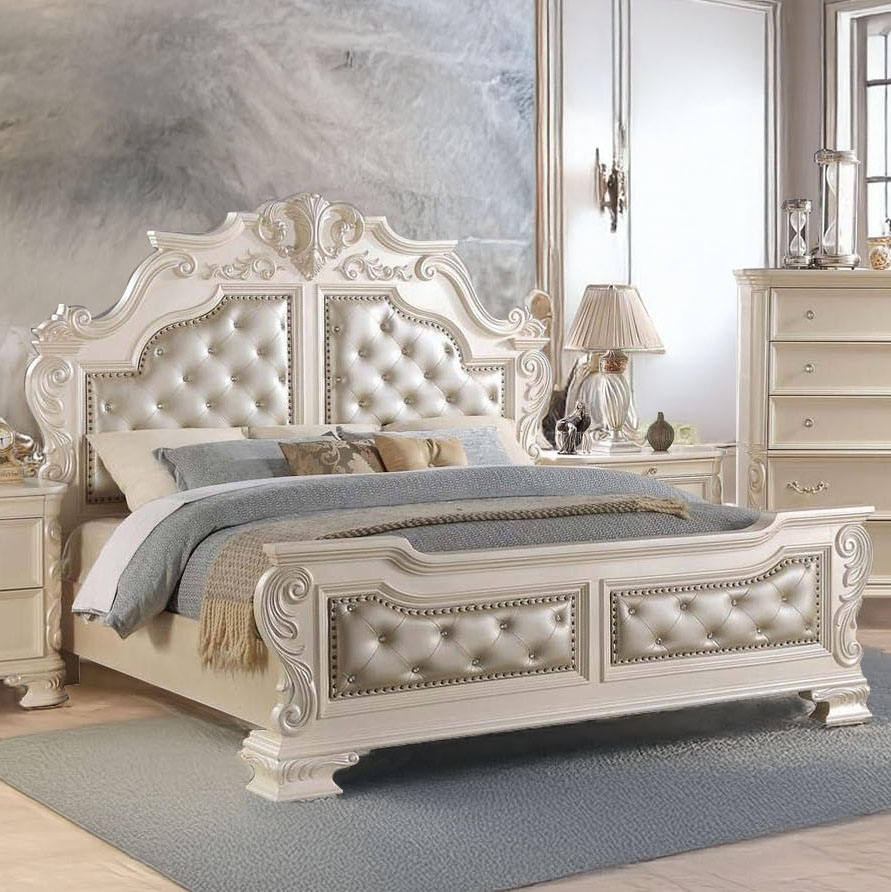 ชุดเฟอร์นิเจอร์ห้องนอนสีขาวงาช้างสไตล์ยุโรปคลาสสิกสุดหรู พร้อมเตียงหุ้มผ้าแบบ Tufted และรายละเอียดแกะสลักด้วยมือ สำหรับห้องนอนใหญ่