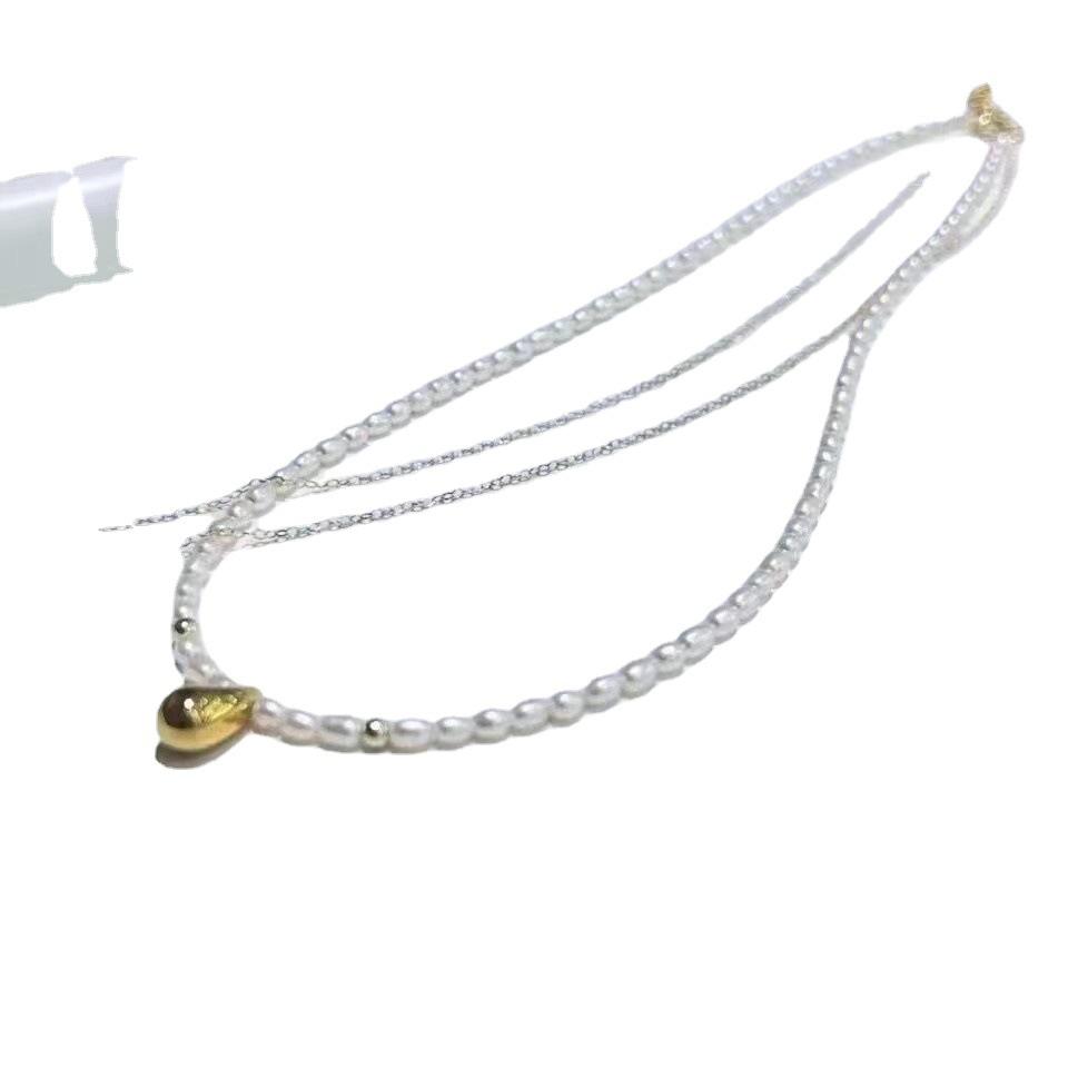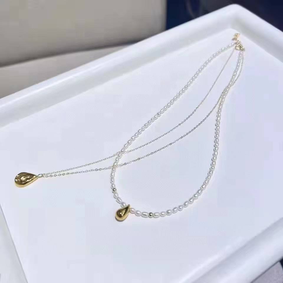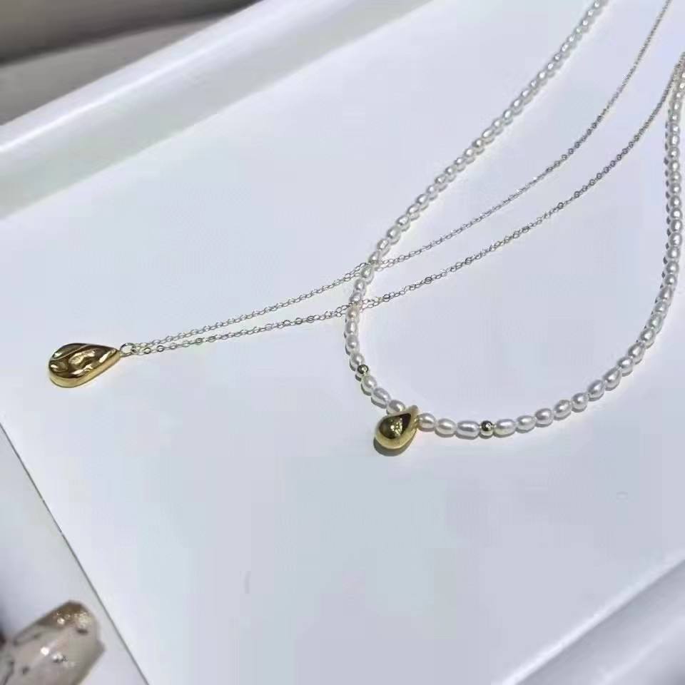 สร้อยคอแฟชั่นสไตล์ยุโรป ลูกปัดสองชั้น ดีไซน์หยดน้ำสามมิติ สร้อยคอประดับลูกปัดน้ำจืดสุดเก๋