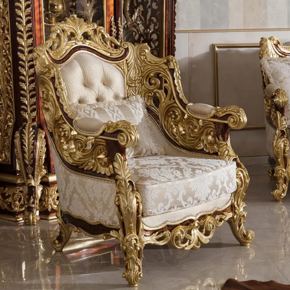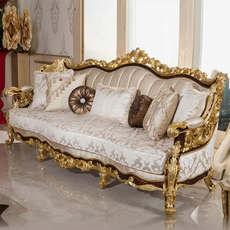 ชุดโซฟาไม้แกะสลักสไตล์ฝรั่งเศสโบราณยุโรปสำหรับห้องนั่งเล่นวิลล่าสุดหรูหุ้มเบาะอย่างดี ทำจากไม้มะฮอกกานีแท้