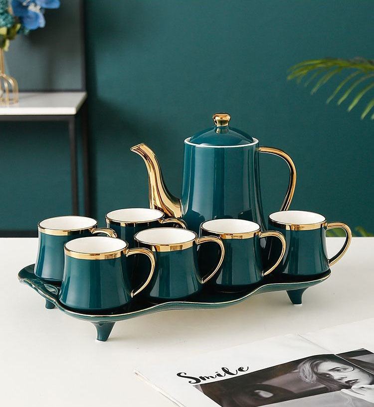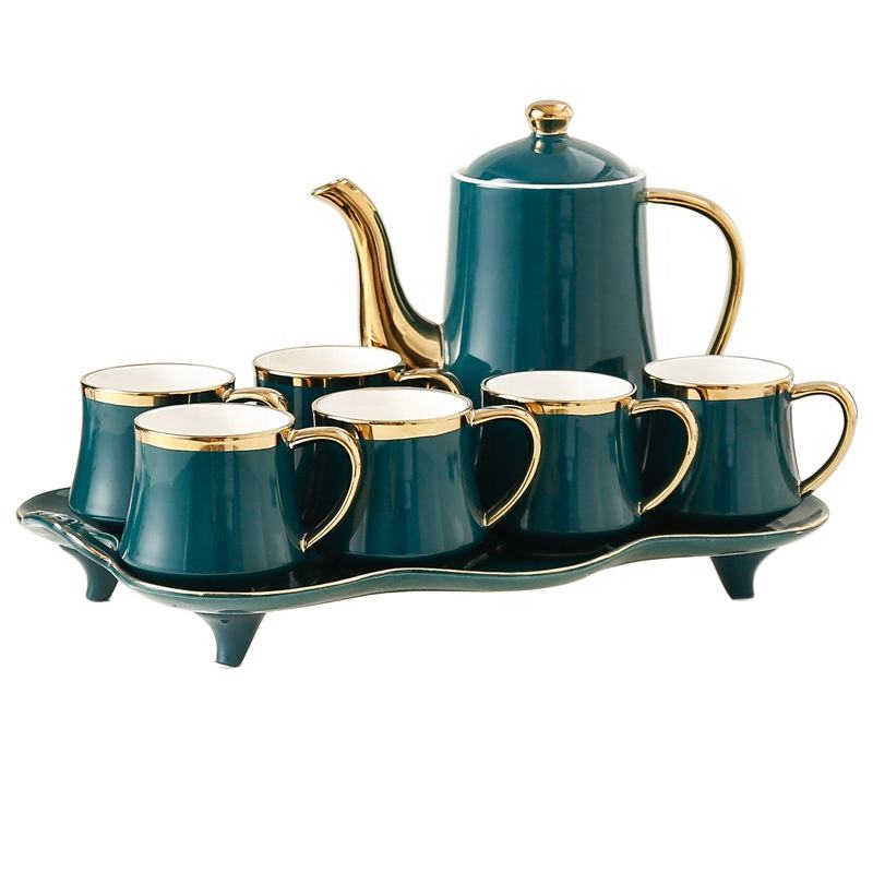 ชุดถ้วยชาและกาแฟสไตล์ยุโรปขอบทอง พร้อมกาน้ำชาและถาดเซรามิก