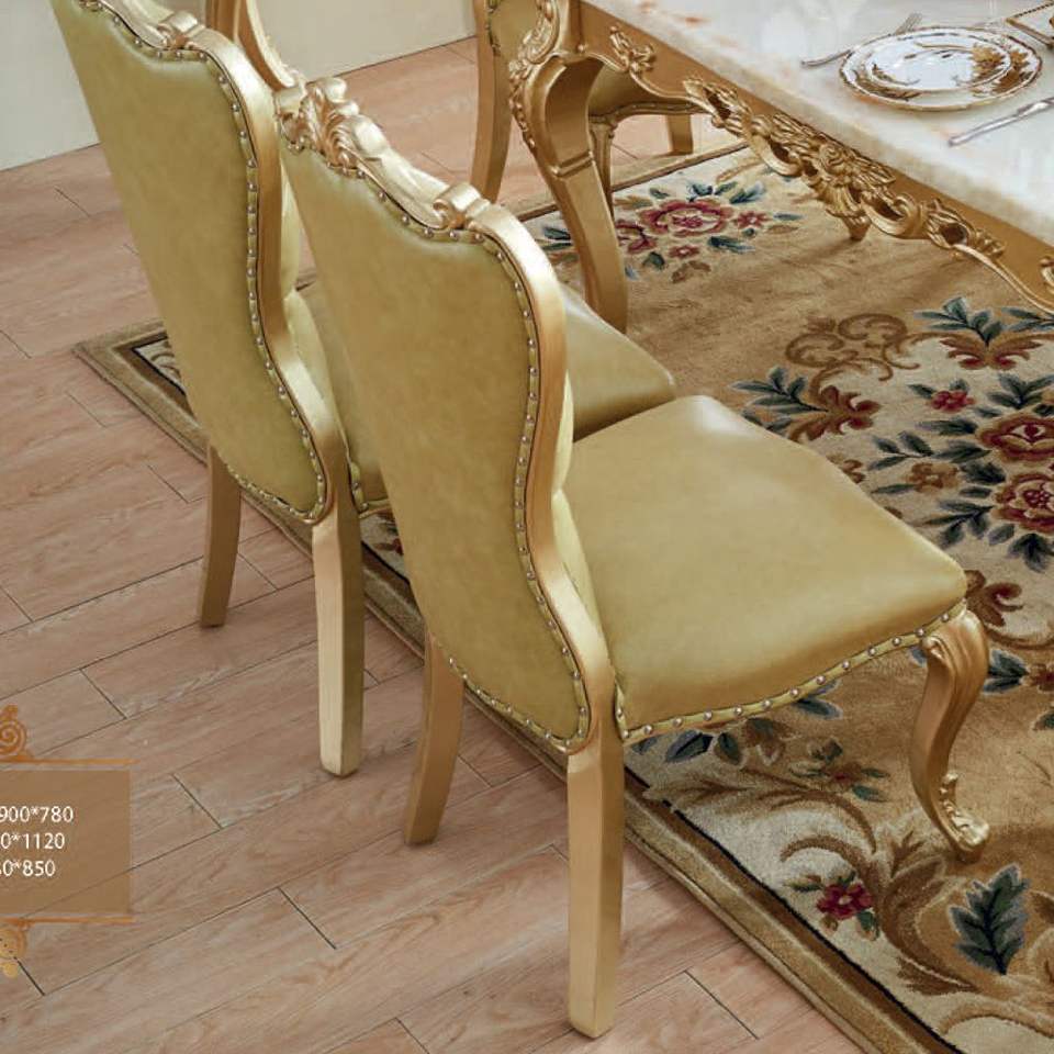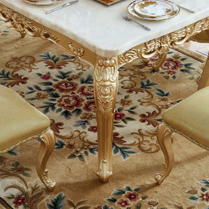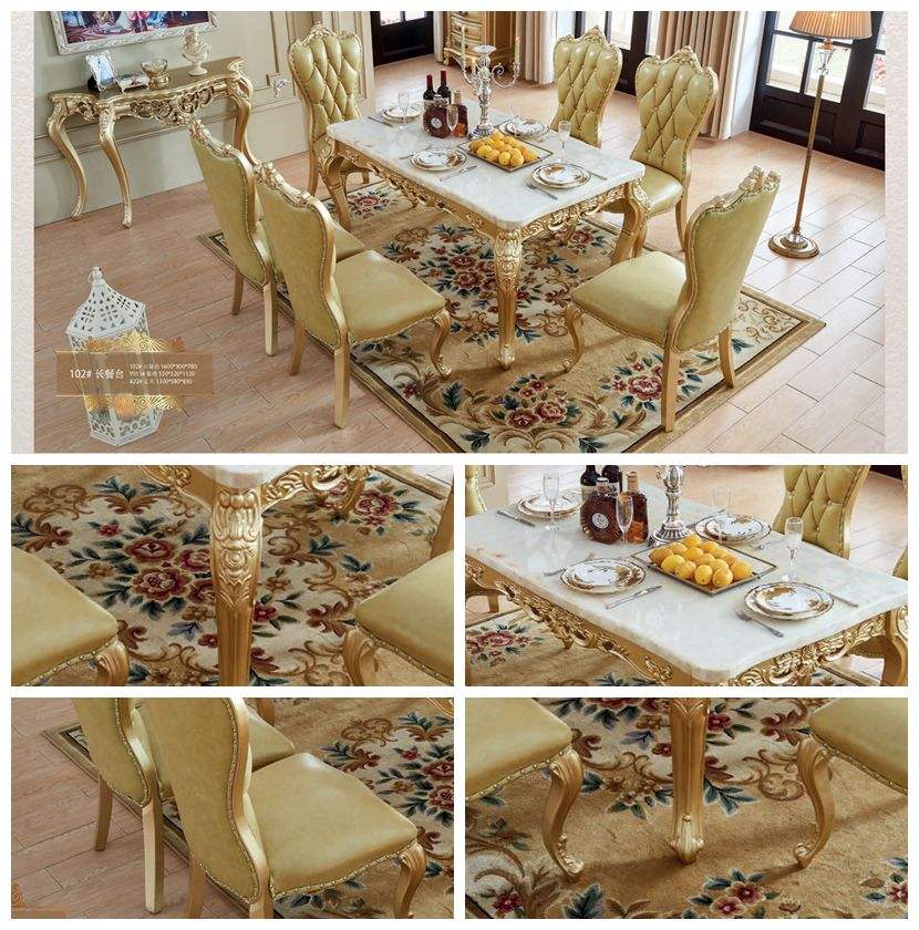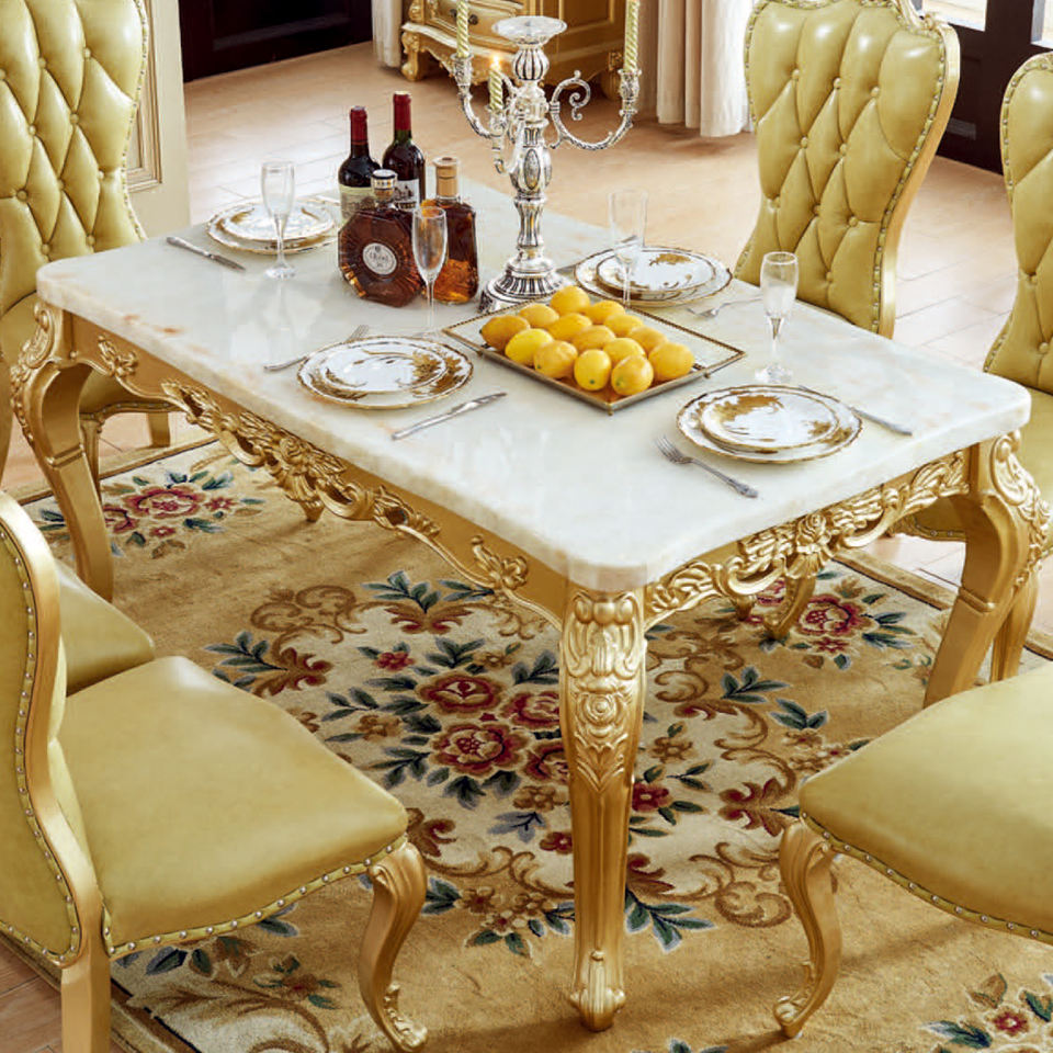ชุดโต๊ะรับประทานอาหารสไตล์ยุโรปโบราณสุดหรู โต๊ะไม้แกะสลักลายคลาสสิก ท็อปหินอ่อนทรงสี่เหลี่ยม พร้อมเก้าอี้หนัง 6 ตัว