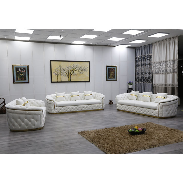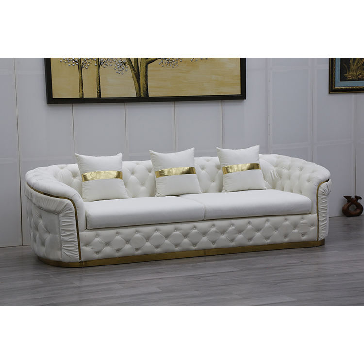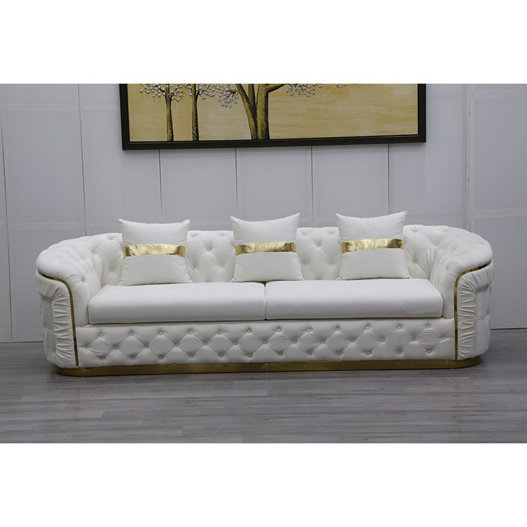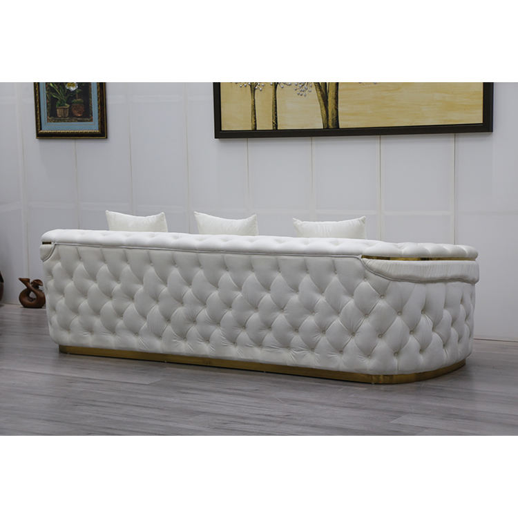 ชุดโซฟาเชสเตอร์ฟิลด์สีขาวสไตล์ยุโรปหรูหรา ขาสีโรสโกลด์ ผ้ากำมะหยี่ ตกแต่งกระดุม ผลิตจากโรงงานโดยตรง เหมาะสำหรับห้องโถงในวิลล่า