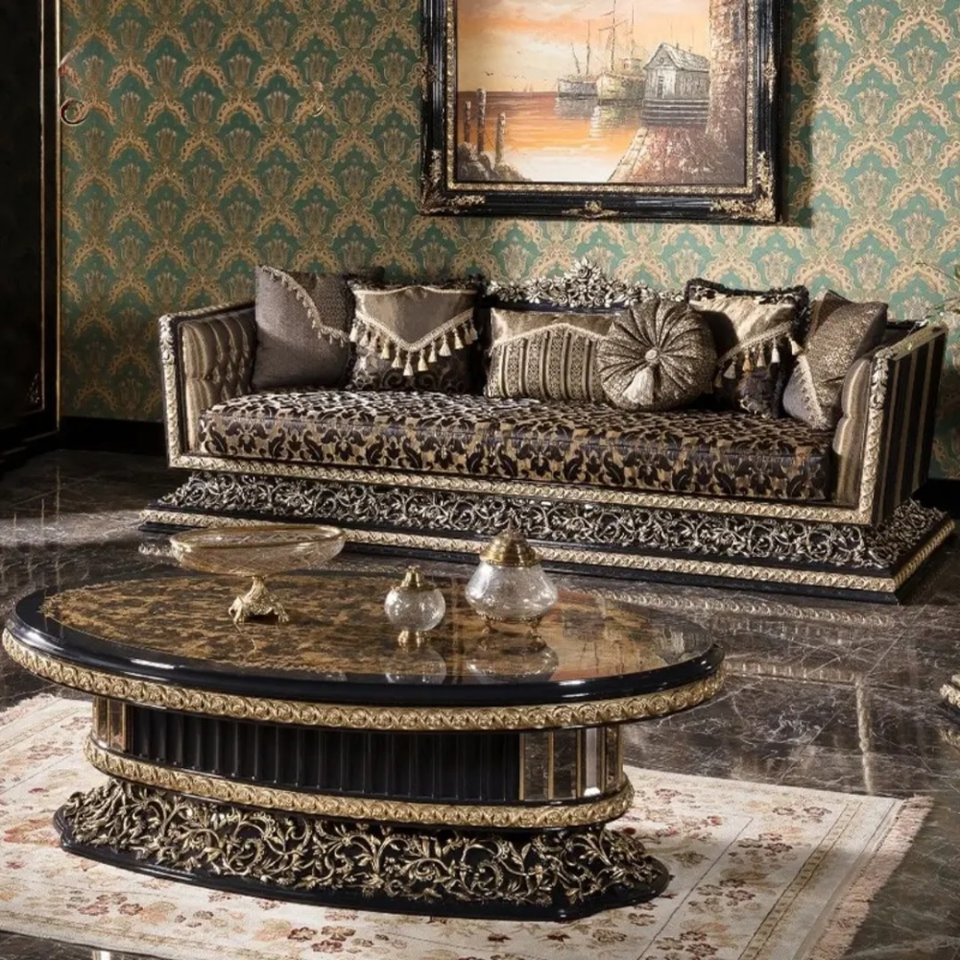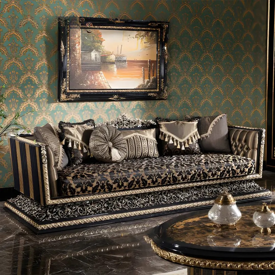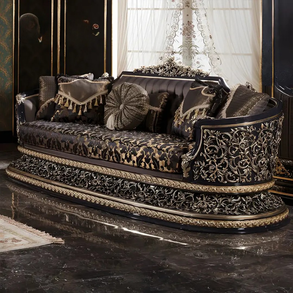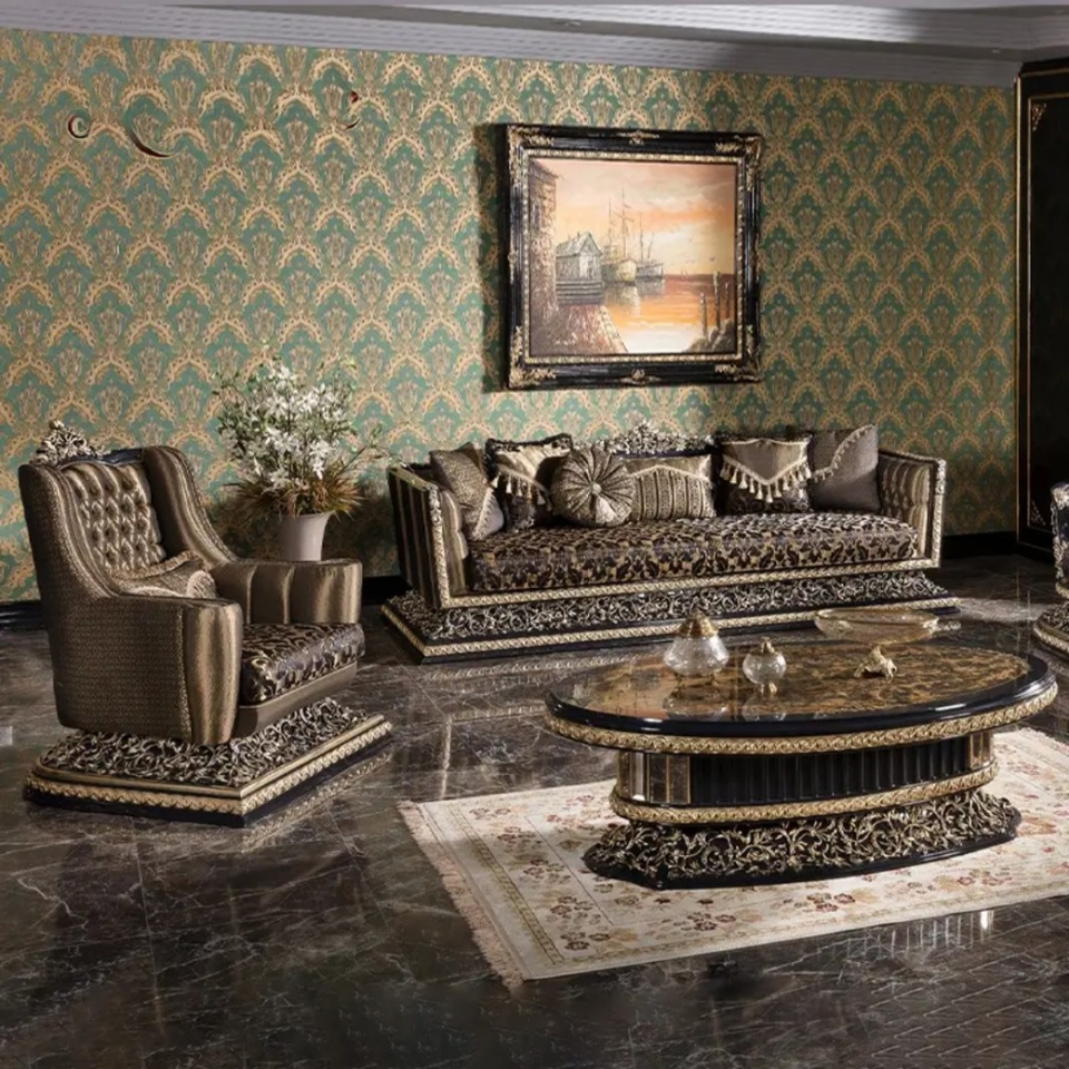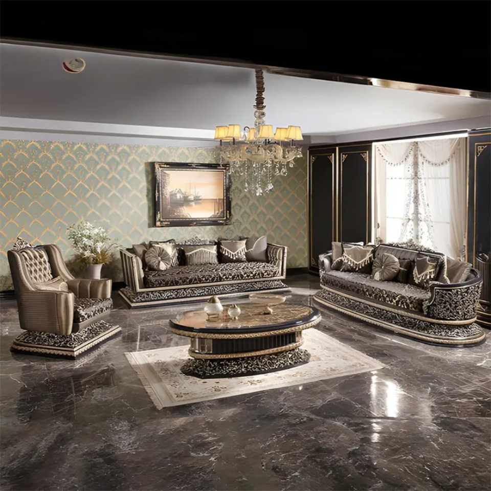 ชุดโซฟาห้องนั่งเล่นวิลล่าไม้มะฮอกกานีแกะสลักสไตล์ฝรั่งเศส ดีไซน์หรูหราแบบยุโรป หุ้มเบาะด้วยมือ ผลิตในอินโดนีเซีย