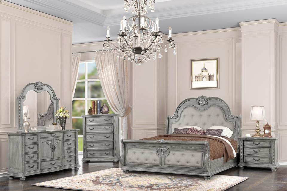 ชุดห้องนอนหรูหราสไตล์ยุโรปสีเทา - เตียงทรงเลื่อนหุ้มผ้าแบบมีกระดุม ตู้เสื้อผ้า โต๊ะข้างเตียง และตู้เก็บของพร้อมลวดลายแกะสลักอย่างประณีตเพื่อความหรูหรา