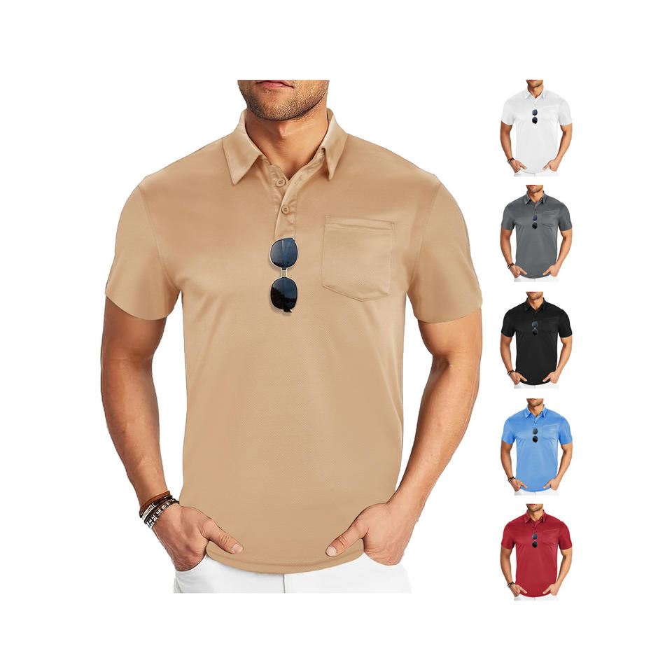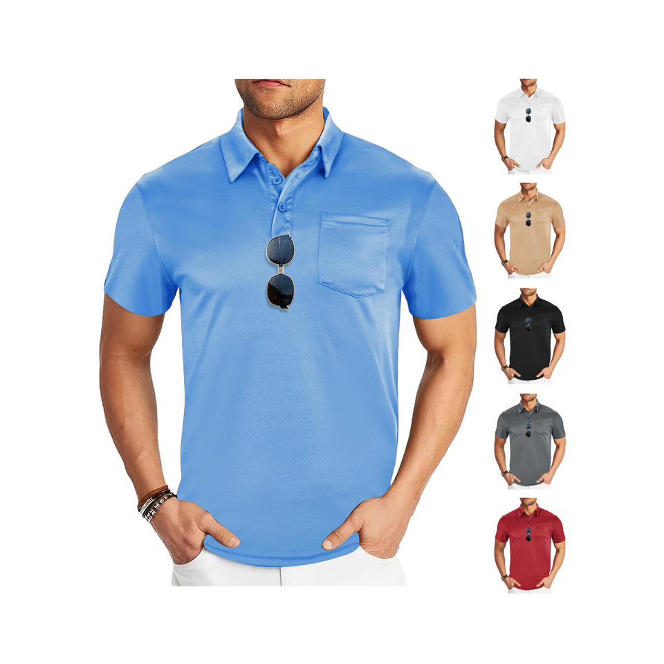 เสื้อโปโลผู้ชายสไตล์ยุโรป สีพื้น ผ้าตาข่ายระบายอากาศ แขนสั้น สปอร์ต แคชชวล มีกระเป๋า สีกากี ขาว ดำ น้ำเงิน แดง
