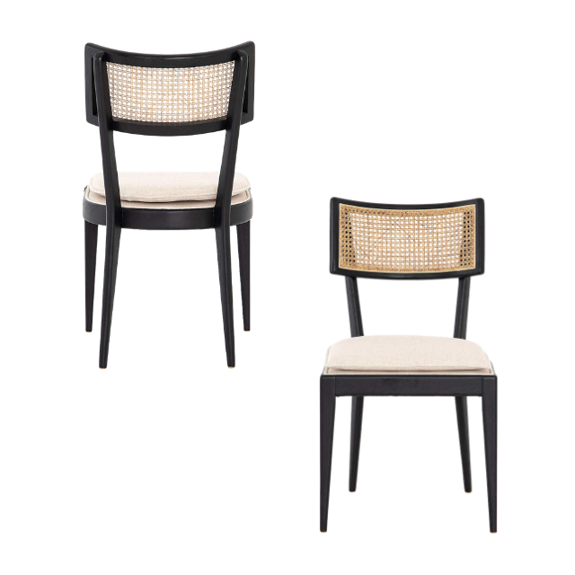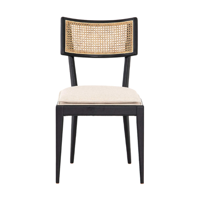 เก้าอี้ทานข้าวดีไซน์ทันสมัยคุณภาพดีเยี่ยม ทำจากไม้สัก หุ้มเบาะ พร้อมพนักพิงไม้และหวาย ตกแต่งสีดำ ลดราคา