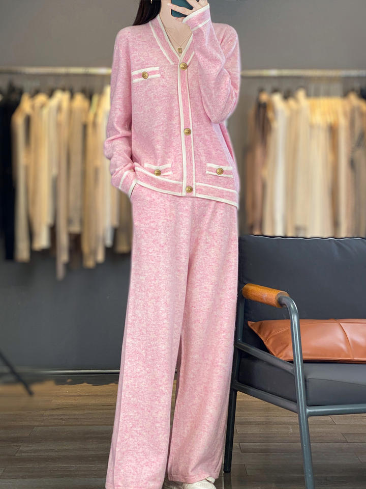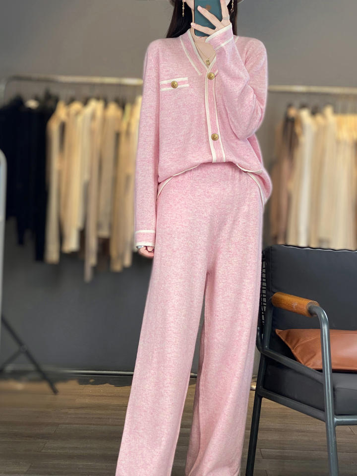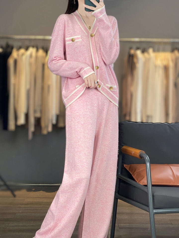 ชุดถักแคชเมียร์สีชมพูสำหรับผู้หญิงเสื้อแจ็คเก็ตคาร์ดิแกนกระดุมสองชิ้นระบายอากาศได้ดีสไตล์ยุโรปฤดูร้อน