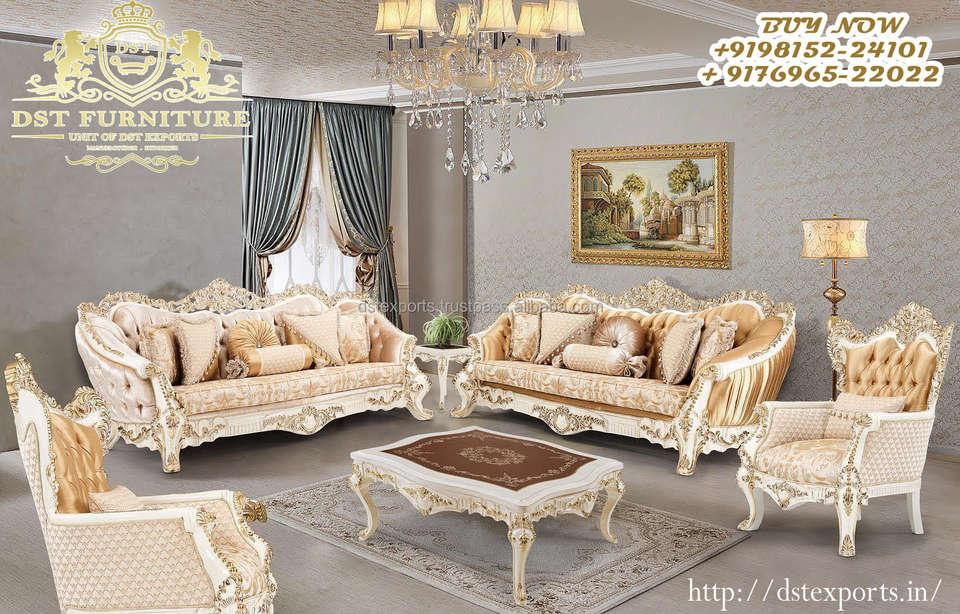 White Gold ชุดโซฟาหุ้มหนัง PU สำหรับห้องนั่งเล่น,เฟอร์นิเจอร์ห้องนั่งเล่นไม้แกะสลักทนทานสีขาวทองหรูหราขนาด8ที่นั่ง