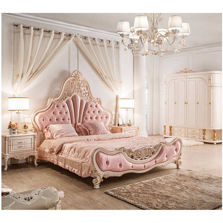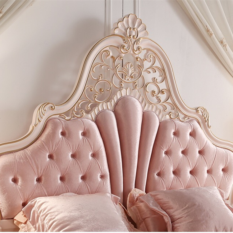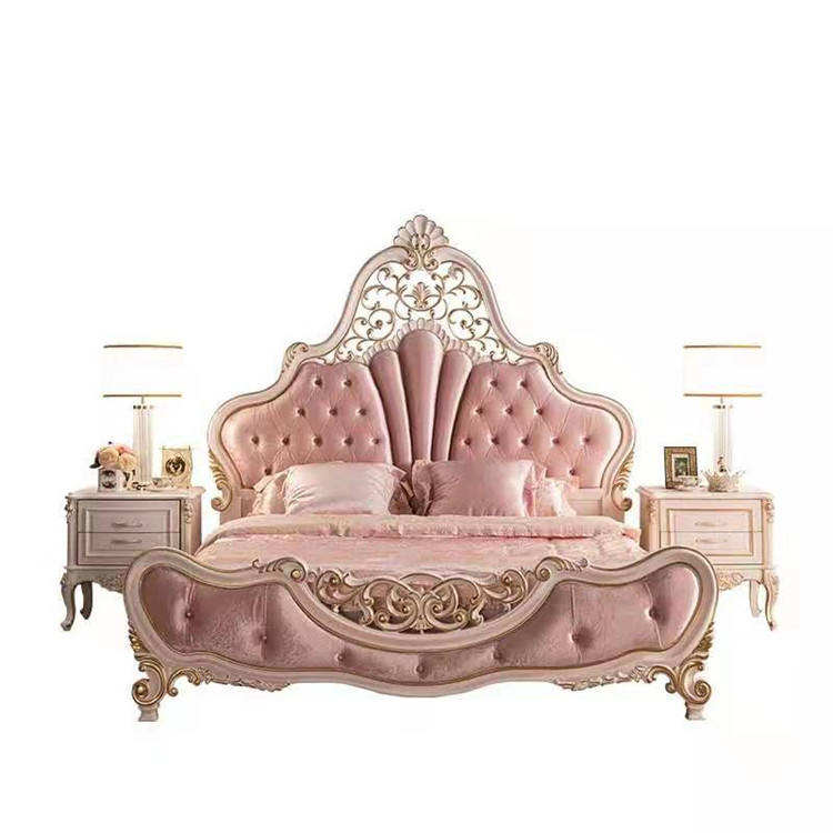 เตียงนอนคู่สไตล์ยุโรป ทำจากไม้เนื้อแข็ง สำหรับห้องนอนใหญ่ แต่งงานได้ แกะสลักลายทอง สีชมพูสไตล์เจ้าหญิง ตกแต่งทั้งหลัง แบบใหม่สั่งทำพิเศษ หรูหราเบาๆ