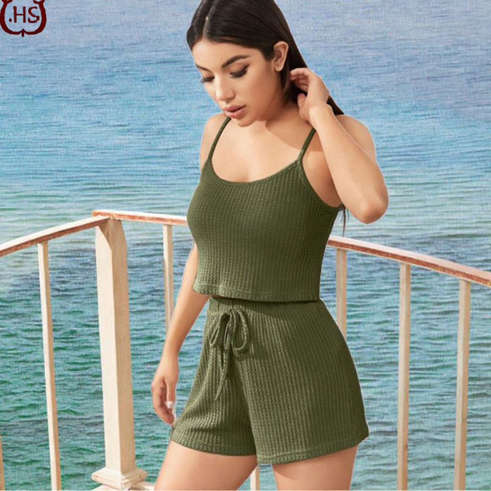 ชุดนอนฤดูร้อนสไตล์ยุโรปสำหรับผู้หญิง แบบปรับแต่งได้ ลายเรียบ เสื้อกล้าม กางเกงขาสั้น ระบายอากาศ เอวยางยืด สวมใส่สบาย ผ้าถัก