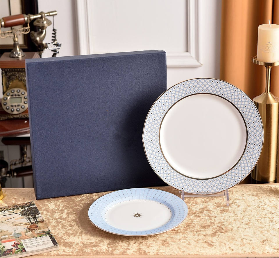 ชุดอาหารค่ำเซรามิกสไตล์ยุโรปตะวันตก หรูหรา สง่างาม ยั่งยืน ใช้กับเครื่องล้างจานได้ ชุดสีน้ำเงินขาว สำหรับโรงแรมและร้านอาหาร