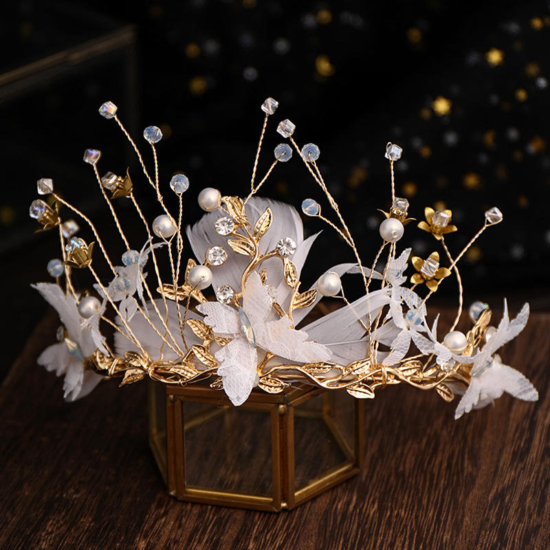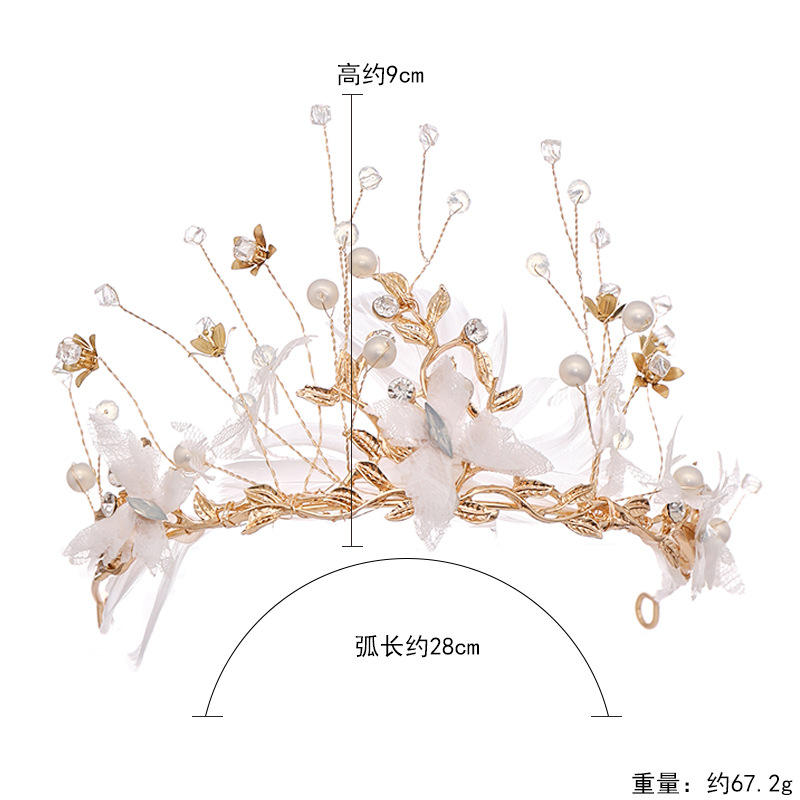 มงกุฎแต่งงานสวยงามสไตล์ยุโรปและอเมริกา มงกุฎเจ้าสาวทำมือประดับขนนก ชุดแต่งงานเจ้าสาว เครื่องประดับศีรษะเจ้าสาว มงกุฎราชวงศ์