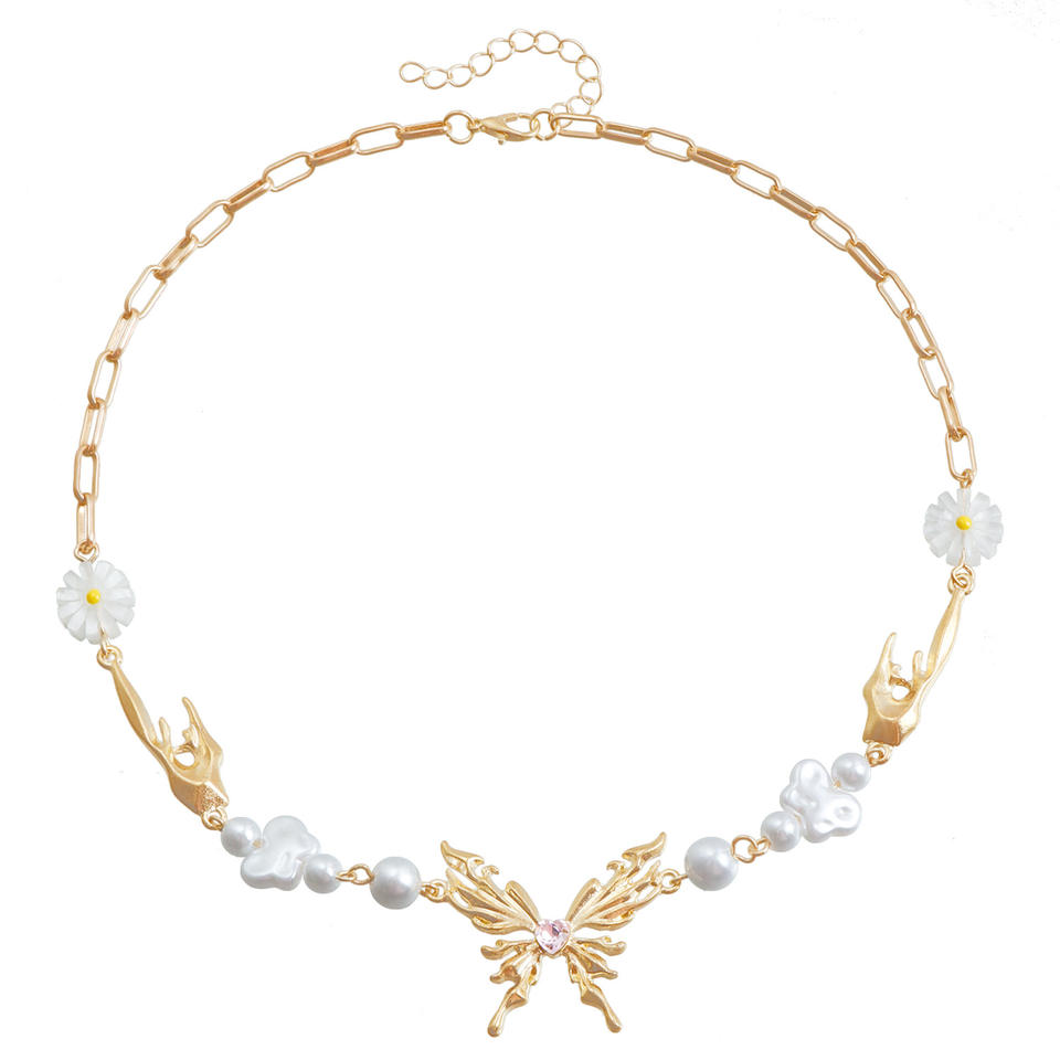 เครื่องประดับแบบข้ามพรมแดนแนวยุโรปและอเมริกันดอกไม้ประดับมุกประกบแบบแปลกๆสร้อยคอรูปหัวใจผีเสื้อ