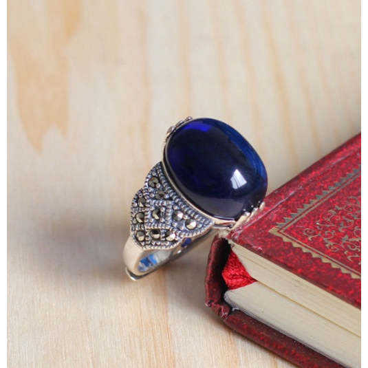 แหวนแฟชั่นสไตล์ยุโรปอเมริกันสำหรับผู้ชาย ประดับด้วยลาพิส ลาซูลีทรงรีธรรมชาติ ตัวเรือนเงินแท้ 925 ขนาด 10