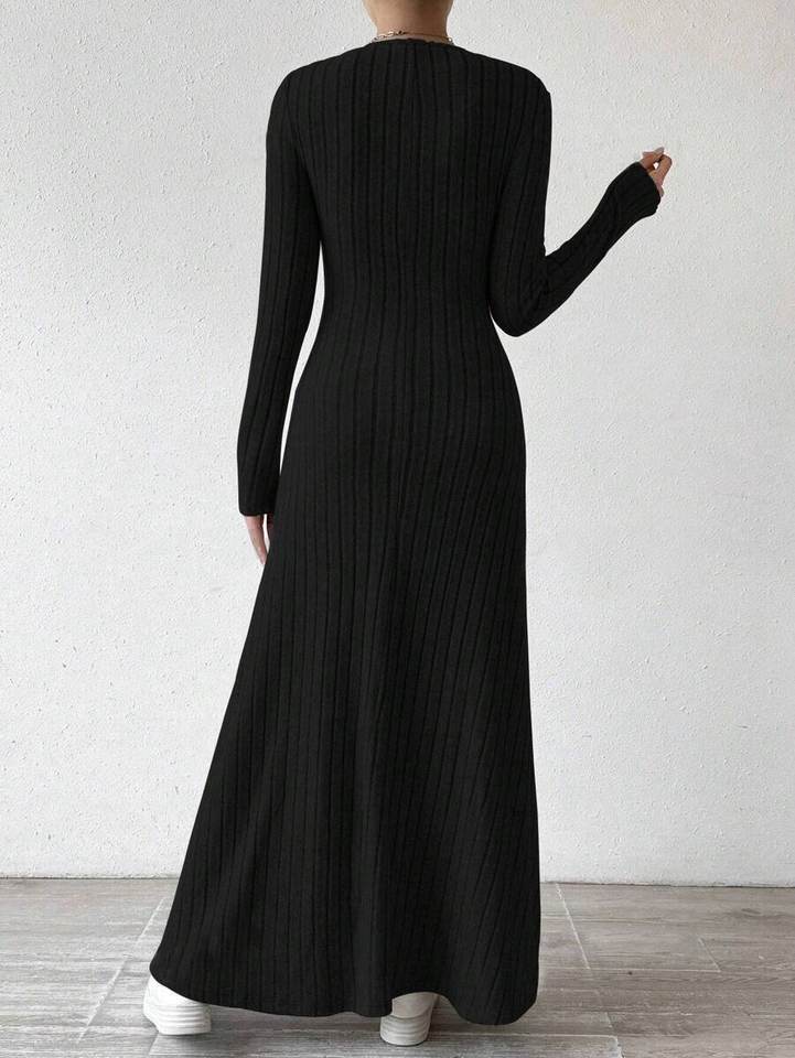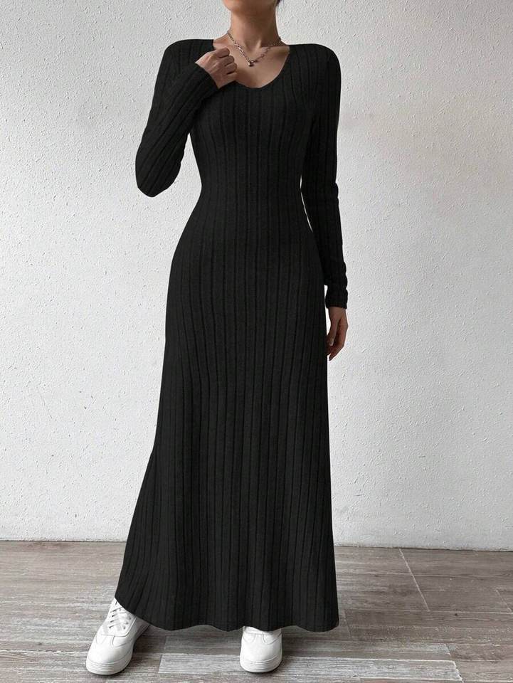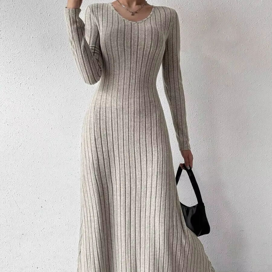 เดรสยาวทรงเอ แขนยาว ผ้าถัก สีพื้น ทรงเข้ารูป สไตล์ยุโรปและอเมริกา สำหรับผู้หญิง ฤดูใบไม้ร่วง ผ้าไม่ยับ