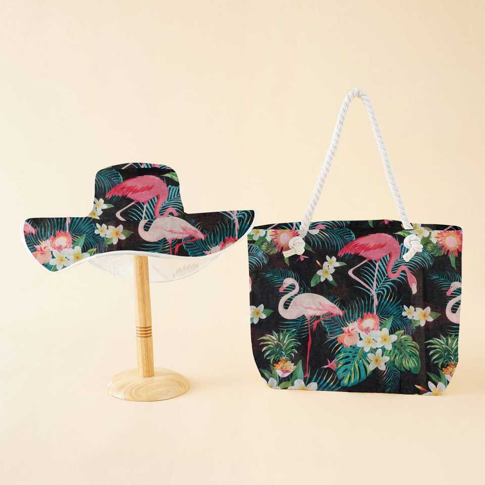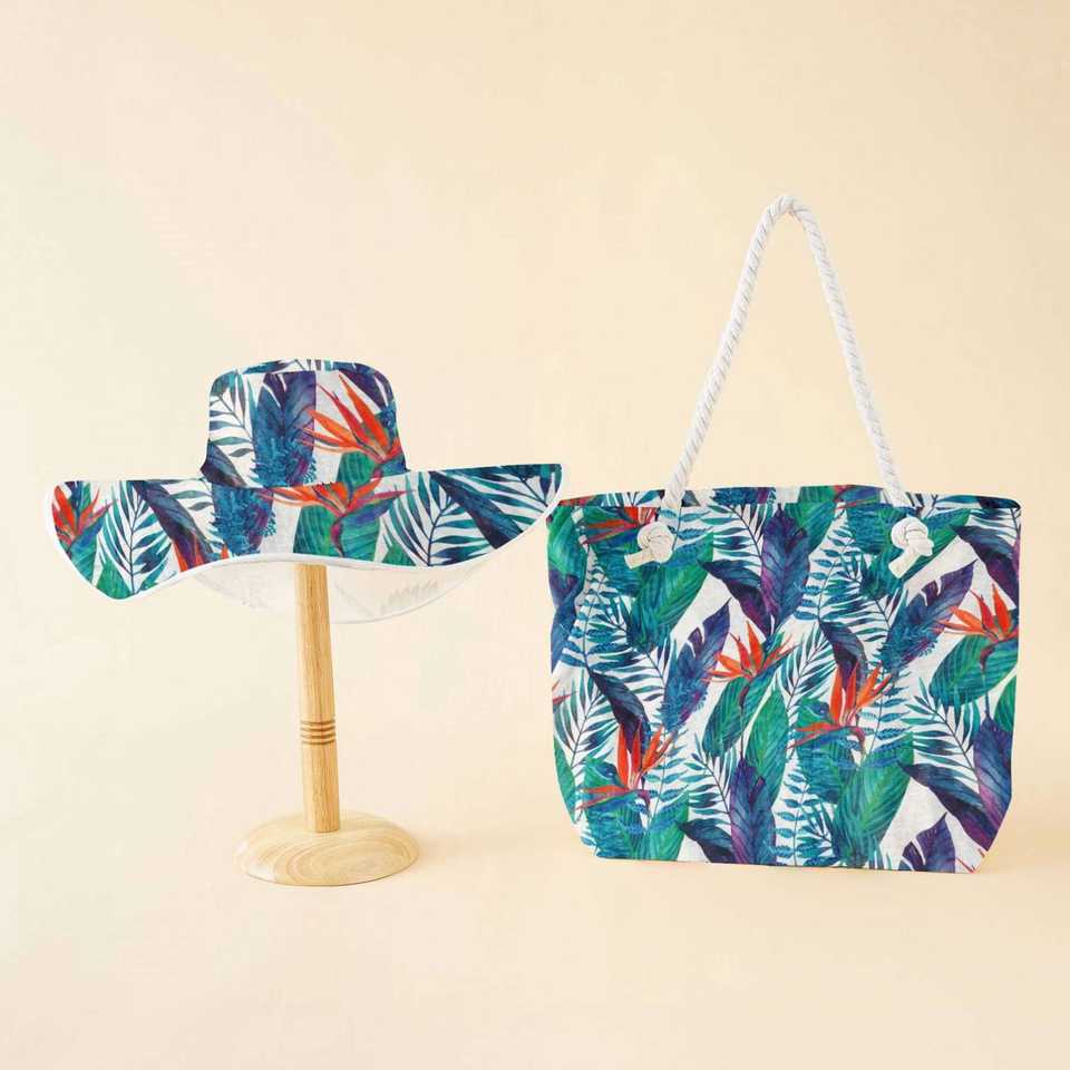 ชุดหมวกชายหาดและกระเป๋าผ้าแคนวาสสองชิ้น