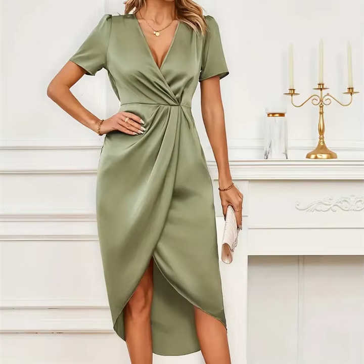 ชุดเดรสยาวไขว้รอบคอแขนสั้นผ้าซาตินสไตล์ยุโรปและอเมริกาสำหรับผู้หญิงฤดูใบไม้ผลิและฤดูร้อน