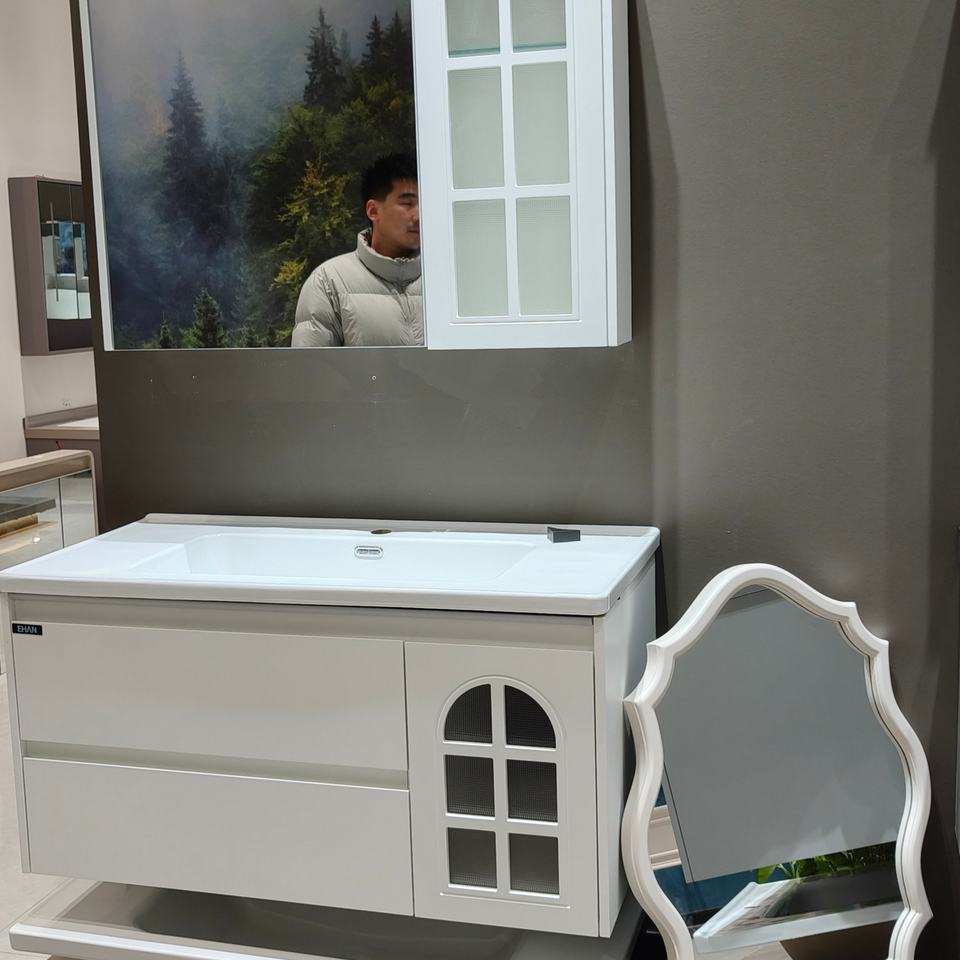ตู้ห้องน้ำติดผนังสไตล์ยุโรปสีขาวเคลือบแลคเกอร์ MDF พร้อมลิ้นชักคู่ ดีไซน์ประตูเดี่ยว กระจกอัจฉริยะ อ่างเซรามิก