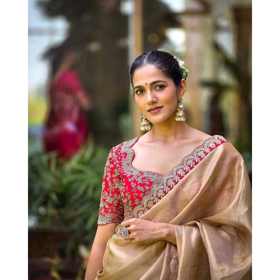 ชุดส่าหรีสีทองสำหรับงานเลี้ยงตอนเย็นโดยงานปักลวดลายสวยงาม