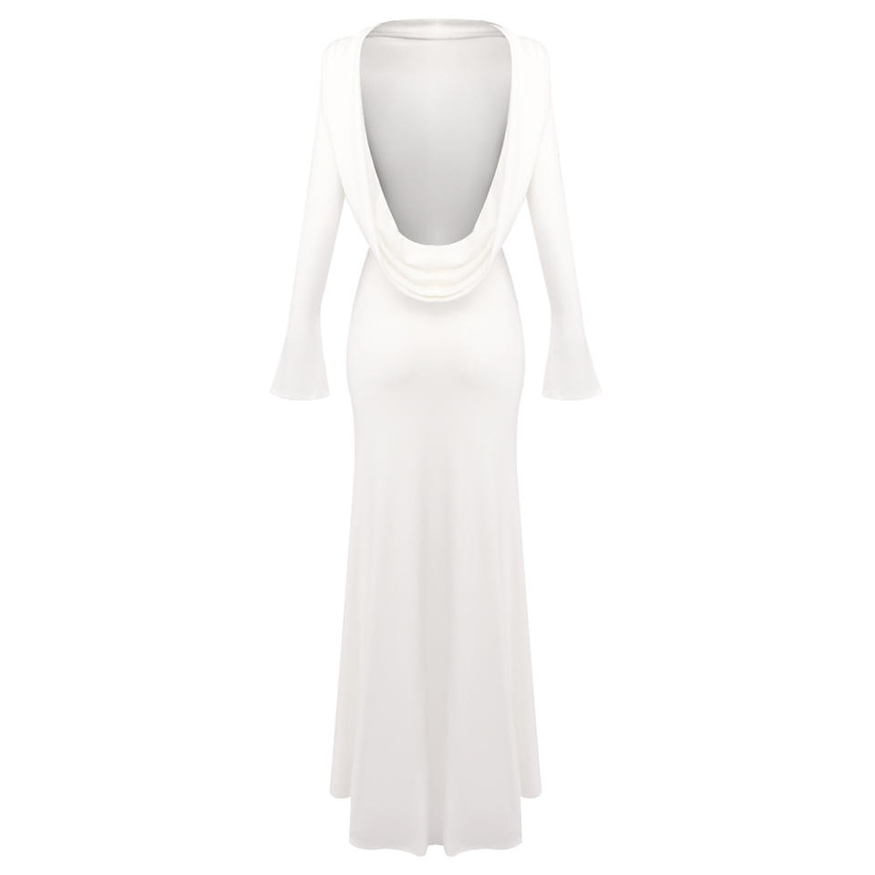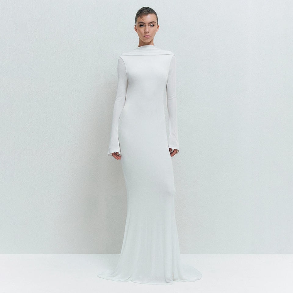 ชุดราตรีทรงเมอร์เมดแขนยาวสีขาวเปิดหลัง ดีไซน์ทันสมัย เหมาะสำหรับงานปาร์ตี้ในสวน สไตล์เซ็กซี่