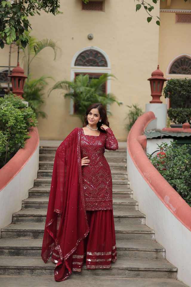 ชุดดีไซน์เนอร์เอเวอร์กรีนกางเกงผ้าจอร์เจียเทียมและ dupatta พร้อมเลื่อมและด้ายปักทำงานผู้ผลิตจากอินเดีย