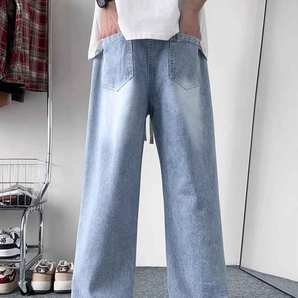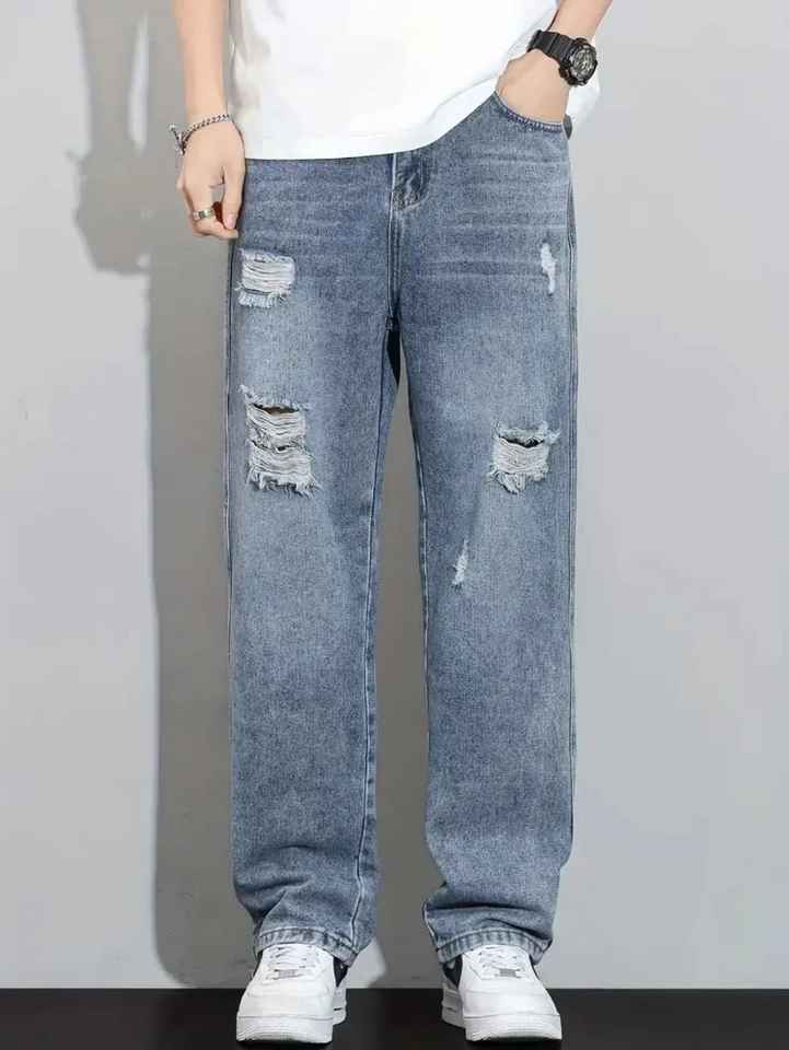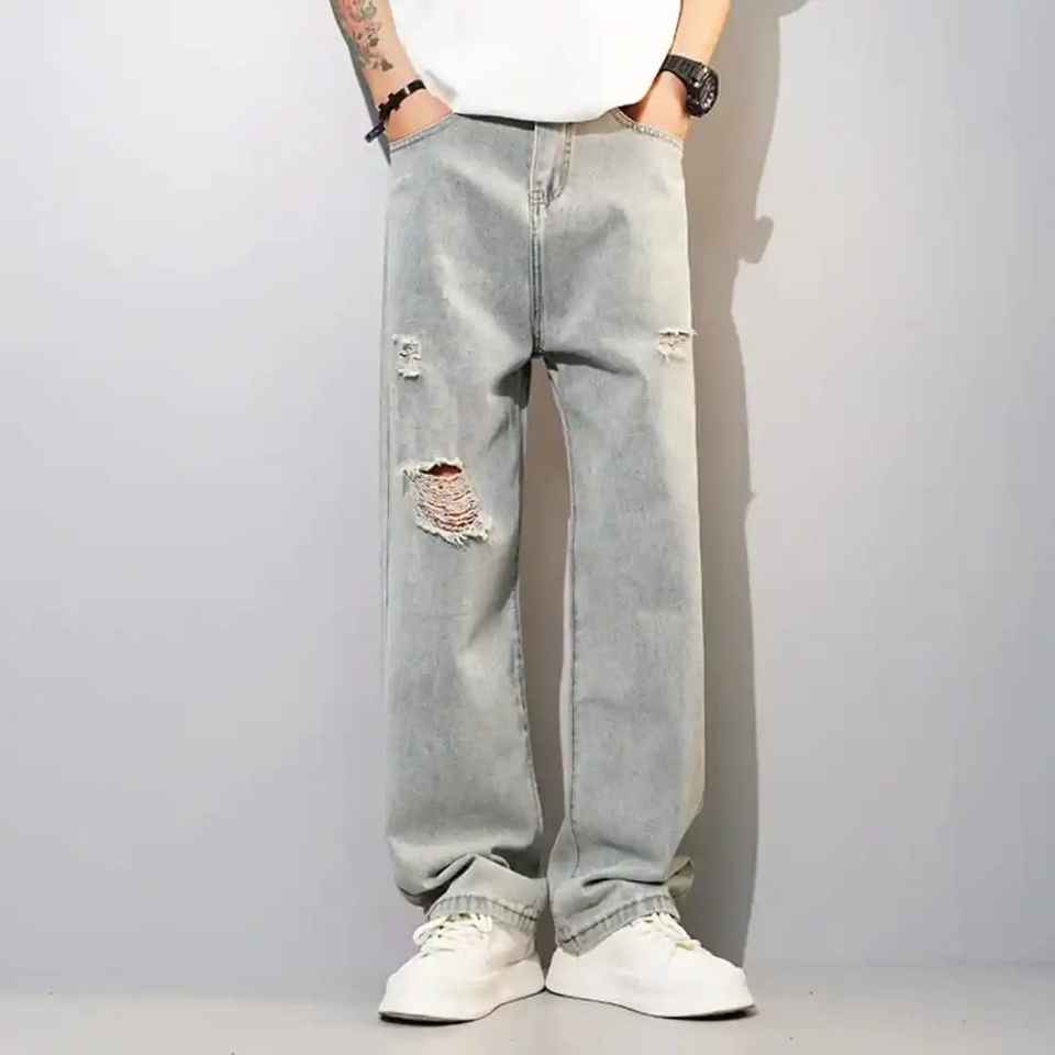 กางเกงยีนส์ขาดแบบลำลองสำหรับผู้ชายใส่ได้ทุกวันกางเกงยีนส์ทรงหลวมทรงหลวมชุดใส่สบายเหมาะสำหรับสตรีทแวร์