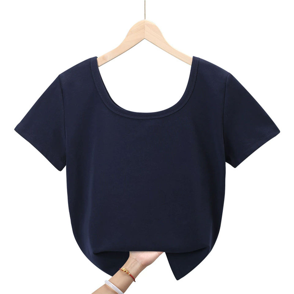 เสื้อยืดผู้หญิงคอกลมเปิดไหล่สมบูรณ์แบบเข้ารูปลำลอง