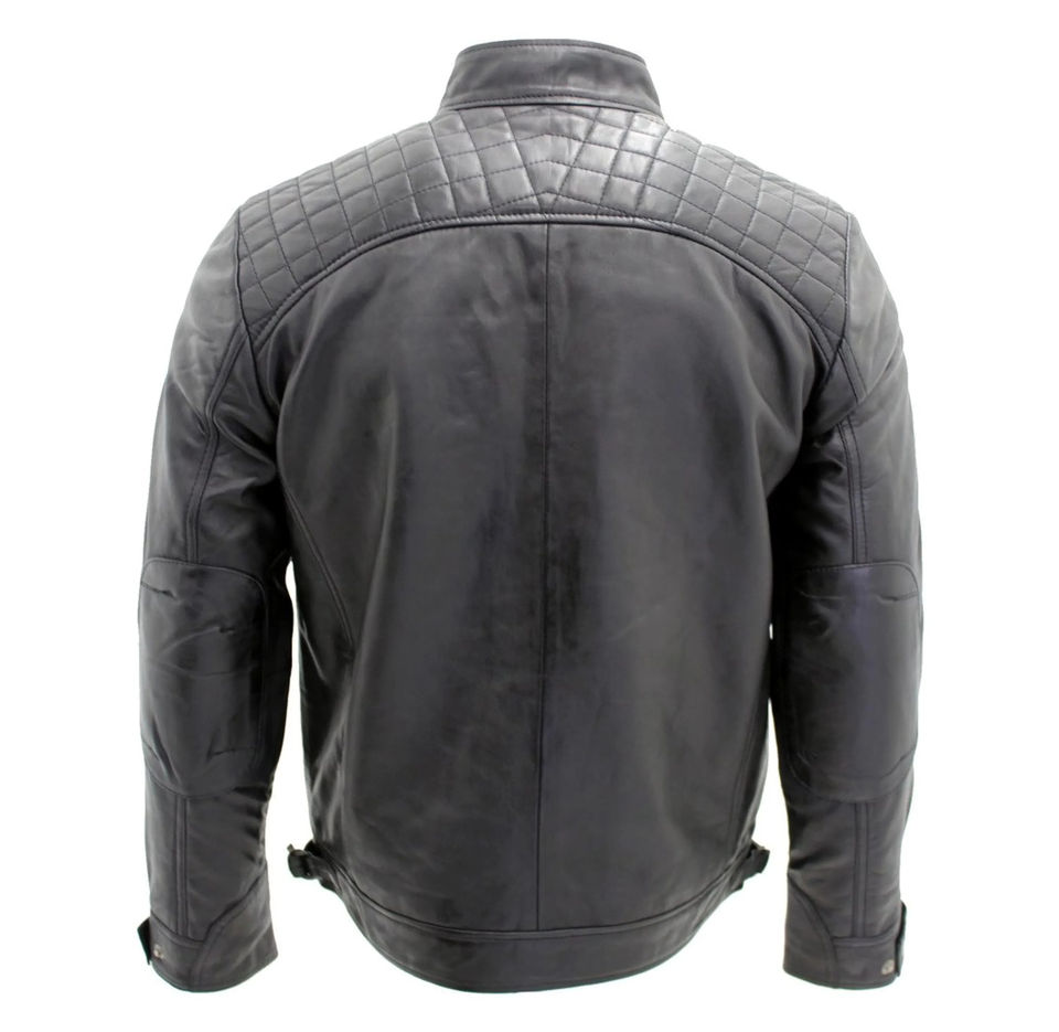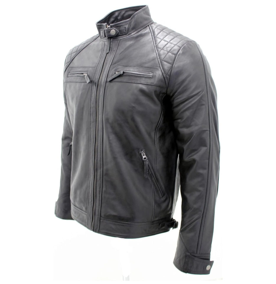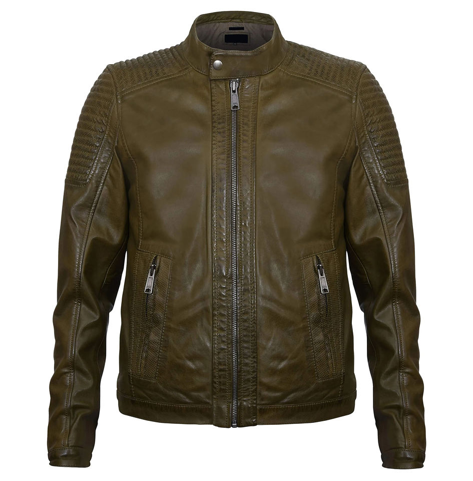 เสื้อแจ็กเก็ตหนังนุ่มสำหรับผู้ชายแบบมีซิปปรับได้มีข้อมือผ้าแคนวาสโลโก้ด้านหน้าสำหรับผู้ชาย